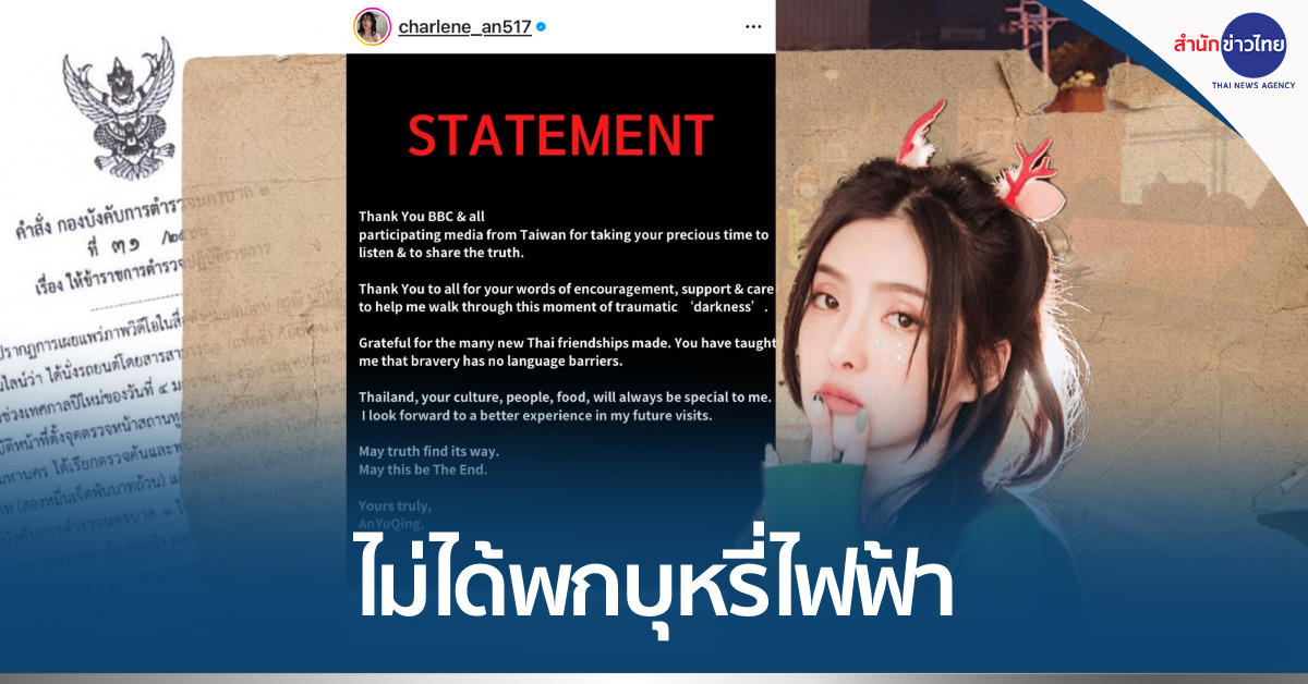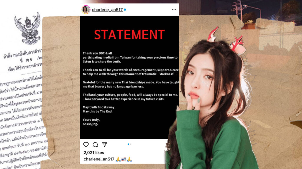 “อันหยูชิง” ดาราสาวไต้หวัน โพสต์ข้อความผ่านอินสตาแกรมล่าสุด ระบุว่า “ขอขอบคุณ BBC และทุกท่าน สื่อทุกสื่อจากไต้หวันที่ได้ร่วมสละเวลาอันมีค่าของทุกท่าน เพื่อรับฟังและแชร์ความจริงขอบคุณในทุกๆคำพูด ที่แสดงถึงการให้กำลังใจ เพื่อสนับสนุนและใส่ใจในการให้ความช่วยเหลือฉัน ในการก้าวผ่านบาดแผลและความมืดมิด ขอบคุณในน้ำใจสำหรับสิ่งที่เพื่อนใหม่ชาวไทยร่วมกันทำ คุณสอนให้ฉันได้รู้จักความกล้าหาญที่ไม่มีกำแพงด้านภาษามาปิดกั้น ประเทศไทย วัฒนธรรมไทย ประชาชน อาหาร จะเป็นสิ่งที่พิเศษกับฉันเสมอไป ฉันจะมองไปข้างหน้าเพื่อประสบการณ์ที่ดีขึ้น สำหรับการมาเยือนในอนาคต การค้นพบความจริงจะทำให้เรื่องนี้ยุติลง ขอแสดงความนับถือ ลงชื่อ “อันหยูชิง”