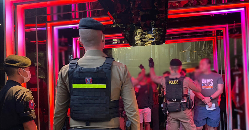 การตรวจค้นพบนักเที่ยวชาวไทยและต่างชาติ กำลังเต้น ดื่มกินกันอย่างสนุกสนาน เจ้าหน้าที่ต้องแยกชายหญิง ตรวจบัตรประชาชน และพาสปอร์ต จากนั้นเจ้าหน้าที่นำสุนัขตำรวจ k9 เข้าตรวจสอบหาสารเสพติดภายในผับดังกล่าว พบมียาเสพติดตกเกลื่อนพื้น จึงตรวจยึดไว้เป็นหลักฐาน