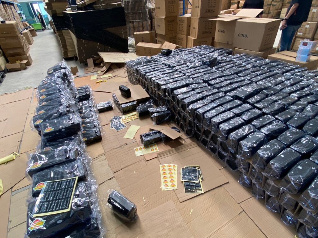 เจ้าหน้าที่ชุดจับกุมนำโดย พ.ต.ท.วัลลภ นุชกำบัง, พ.ต.ท.มงคล นนท์ธีระโรจน์, พ.ต.ท.ภูมิพัฒน์ บัวรัตนกุล, พ.ต.ท.อภิเดช อธิคมสัญญา สว.กก.3 บก.ปคบ. พร้อมด้วยตำรวจ กก.3 บก.ปคบ.สืบสวนพบการกระทำความผิดเกี่ยวกับผลิตภัณฑ์ที่ไม่ได้รับมาตรฐานผลิตภัณฑ์อุตสาหกรรม (ไม่มี มอก.) และผลิตภัณฑ์ที่เป็นการปลอมยี่ห้อแบรนด์ดังที่ไม่มี มอก. ทั้งจากช่องทางออนไลน์, การลงพื้นที่สืบสวนหาข่าว และการออกตรวจสอบร้านจำหน่าย จนนำไปสู่การเข้าทำการตรวจค้นแหล่งผลิตและกักเก็บผลิตภัณฑ์ที่ไม่มี มอก. จำนวนทั้งสิ้น 4 จุด โดยมีรายละเอียดสถานที่ตรวจค้นดังนี้ 1.โกดังเก็บสินค้า อำเภอเมือง จังหวัดนครปฐม 2.อาคารพาณิชย์ เขตวังทองหลาง กรุงเทพมหานคร 3.โกดังเก็บสินค้า เขตบางขุนเทียน กรุงเทพมหานคร 4.อาคารพาณิชย์ เขตบางแค กรุงเทพมหานคร