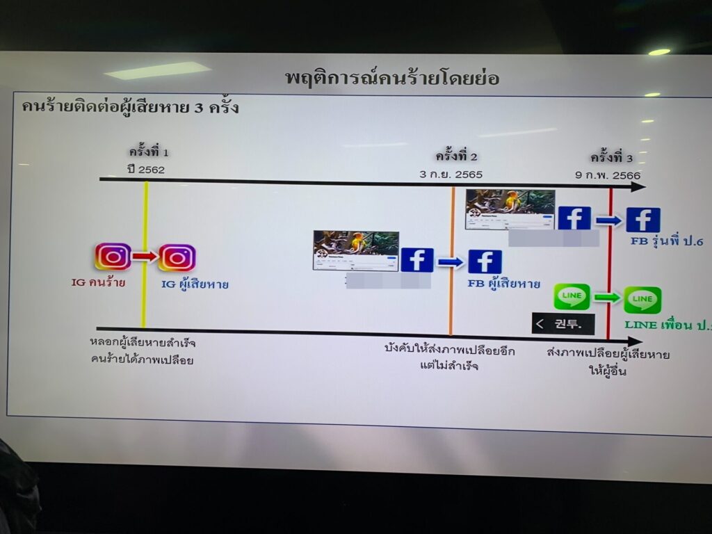 กระทั่งวันที่ 3 กันยายน 2565 คนร้ายได้ใช้ Facebook ติดต่อกลับมายังเยาวชนผู้เสียหาย โดยมีการส่งรูปโป๊เปลือยที่เคยส่งให้เมื่อปี 2562 กลับมาให้ตัวเยาวชน พร้อมข่มขู่ให้ส่งภาพโป๊เปลือยไปให้อีก หากไม่ทำตามจะนำภาพโป๊เปลือยที่เคยส่งให้เมื่อปี 2562 ไปเผยแพร่ใน Facebook จนทำให้เด็กหวาดกลัวและตัดสินใจบอกให้ผู้ปกครองทราบ ซึ่งผู้ปกครองเข้าแจ้งความลงบันทึกประจำวันไว้