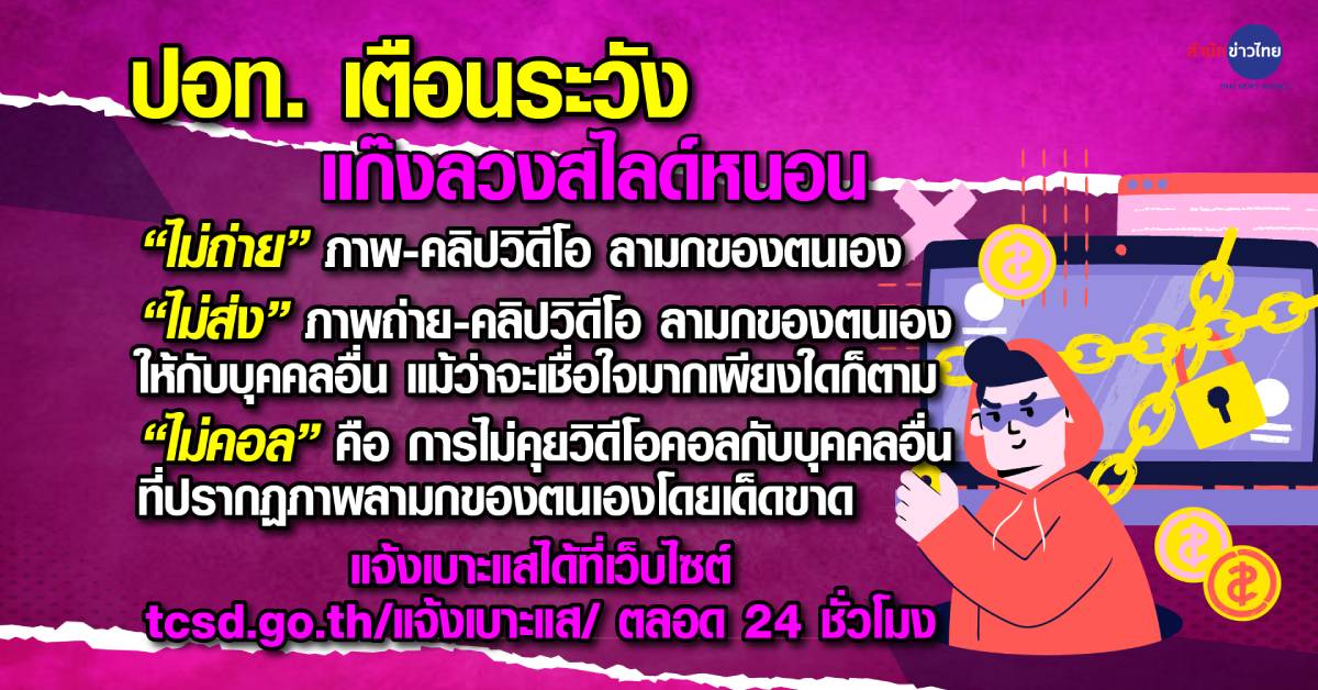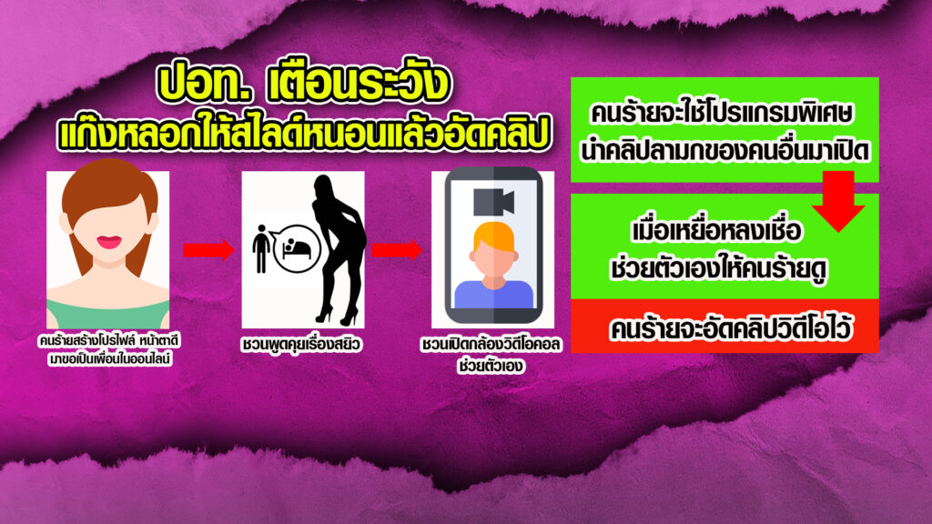 กทม. 14 ก.พ. – ปอท. ออกโรงเตือน ช่วงนี้ชายไทยต้องระวังแก๊งลวงสไลด์หนอน แล้วหลอกอัดคลิป จ่ายไม่จบ สูญเงินฟรี