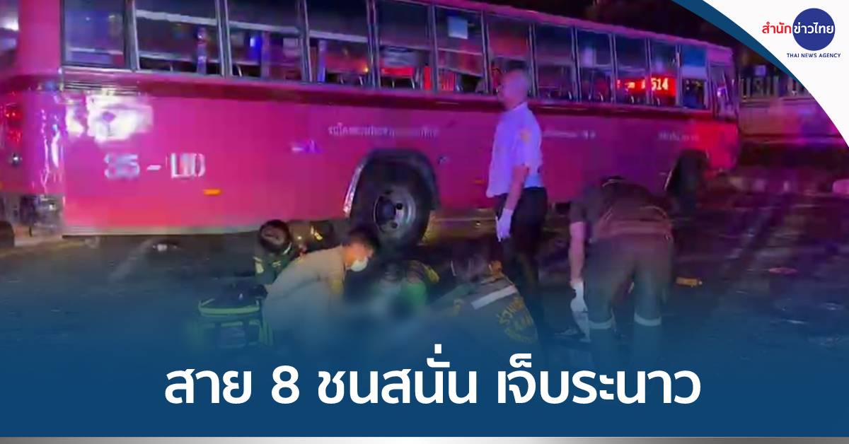 เวลาประมาณ 05.30 น.วันนี้ เกิดอุบัติเหตุรถโดยสารประจำทางสาย 8 แฮปปี้แลนด์-สะพานพุทธ ที่ขับมาจากบางกะปิถนนลาดพร้าวขาเข้า มุ่งหน้าห้าแยกลาดพร้าว ชนเข้ากับรถบรรทุก 4 ล้อเล็ก ทำให้ด้านข้างฝั่งซ้ายรถบรรทุกพังยับเยิน และคนงานที่นั่งมาเต็มกระบะบรรทุกได้รับบาดเจ็บกว่า 10 คน ในจำนวนนี้มีบาดเจ็บสาหัส 4 คน และบางคนติดอยู่ภายในรถ เจ้าหน้าที่กู้ภัยต้องใช้อุปกรณ์ตัดถ่าง นำตัวผู้บาดเจ็บออกมาและนำส่งโรงพยาบาลอย่างเร่งด่วน