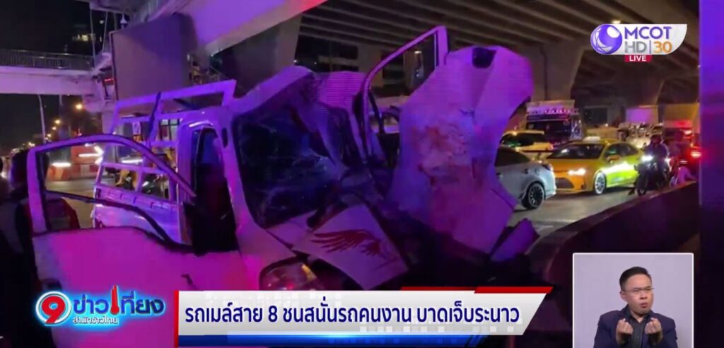 กรุงเทพฯ 20 ก.พ.- เกิดอุบัติเหตุรถประจำทางสาย 8 ชนกับรถ 4 ล้อเล็กบรรทุกคนงาน บริเวณแยกรัชดาฯ-ลาดพร้าว เมื่อช่วงเช้ามืด ทำให้มีผู้ได้รับบาดเจ็บกว่า 10 คน ในจำนวนนี้สาหัสถึง 4 คน ฝั่งรถเมล์ ก็เจ็บทั้งคนขับ กระเป๋ารถ และผู้โดยสาร รวม 5 คน