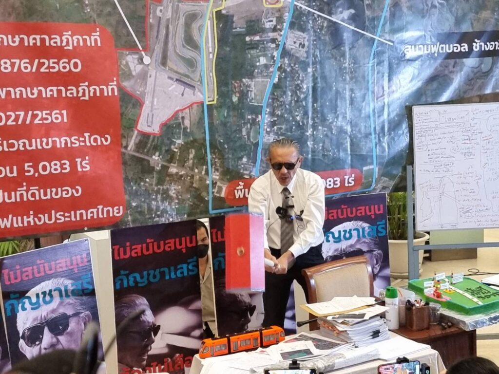จากนั้น นายชูวิทย์ เปิดข้อมูลที่ดินเขากระโดง จ.บุรีรัมย์ 5,083 ไร่ ซึ่งเป็นที่การรถไฟแห่งประเทศไทย นายชูวิทย์ กล่าวอ้างว่านายศักดิ์สยาม นายเนวิน และเครือญาติ ใช้การสร้างสนามฟุตบอล สนามแข่งรถ เพื่อส่งเสริมด้านกีฬาบังหน้า ทั้งที่ความจริงต้องการยึดที่ดินไว้เป็นของตัวเอง รวมถึงใช้เทคนิคทางกฎหมายฟ้องคดีเพื่อยื้อในการได้ครอบครองที่ดินนานขึ้น ซึ่งยังมีบ้านพักของนายศักดิ์สยาม บ้านพักของนายเนวินและเครือญาติ รวมถึงที่ทำการพรรคภูมิใจไทย ก็อยู่ในพื้นที่เขากระโดงด้วย แต่กลับไม่ต้องย้ายออก ขณะที่ชาวบ้าน 35 ราย ถูกการรถไฟฯ ฟ้องขับไล่แพ้คดีต้องย้ายออกจากพื้นที่ทั้งหมด