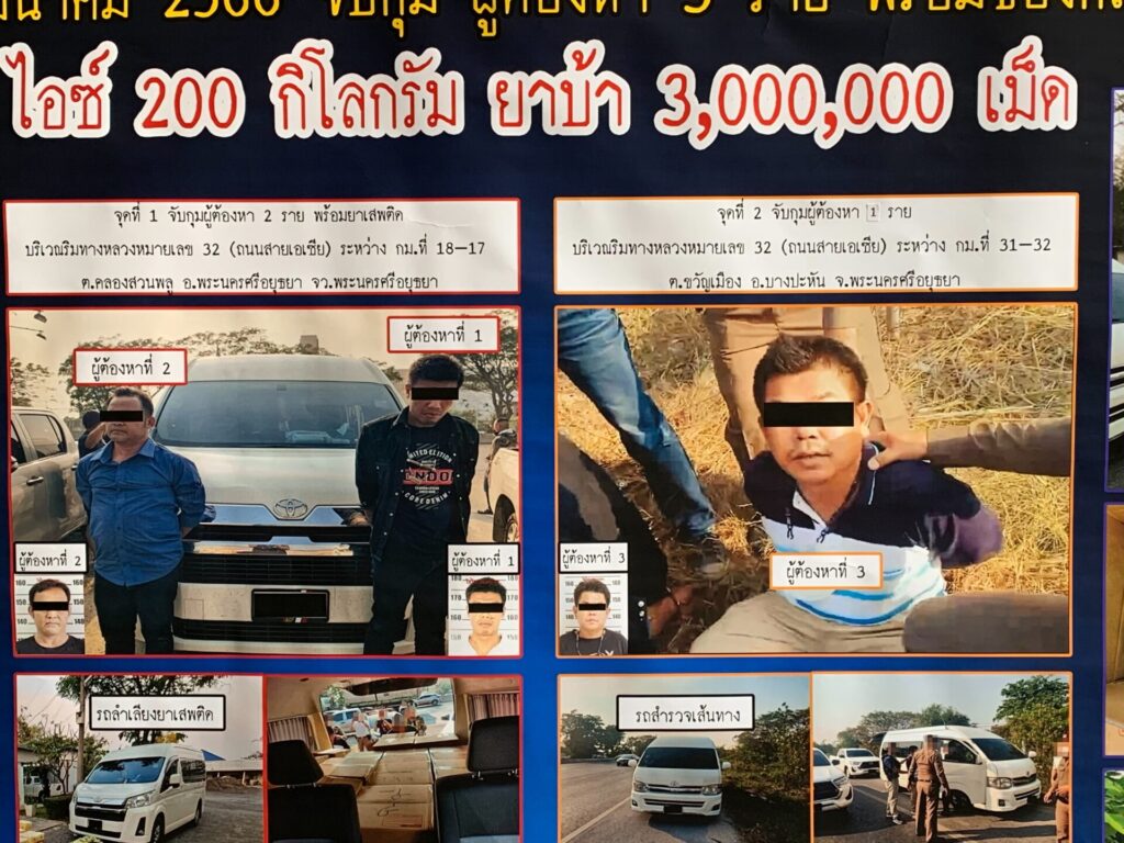 นอกจากนี้ ยังจับกุมนายณัฐวุฒิ นายสุรัต และนายรังสี ได้บริเวณริมถนนหมายเลข 32 สายเอเชีย ตำบลขวัญเมือง อำเภอบางปะหัน จังหวัดพระนครศรีอยุธยา พร้อมยึดยาบ้า 3,000,000 เม็ด ไอซ์ 200 กิโลกรัม ซุกซ่อนอยู่ภายในกล่องกระดาษสีน้ำตาล วางอยู่ในห้องโดยสารของรถตู้ สืบสวนทราบว่ากลุ่มผู้ต้องหากลุ่มนี้มักลำเลียงยาเสพติดจากพื้นที่ภาคเหนือนำส่งลูกค้าในพื้นที่ภาคกลาง โดยใช้รถตู้เป็นพาหนะในการขนส่งยาเสพติด