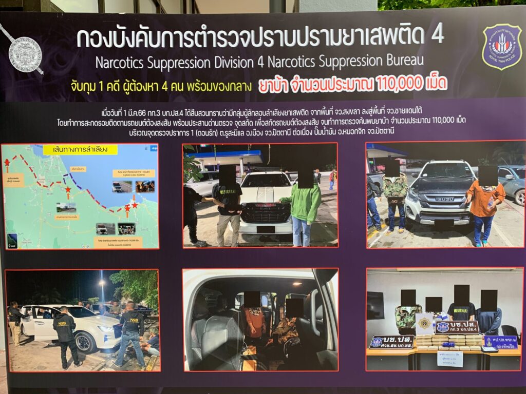 คดีสุดท้าย จับกุม 4 ผู้ต้องหา ขณะเตรียมลักลอบนำยาเสพติดจากพื้นที่รัตภูมิ จังหวัดสงขลา ไปส่งให้เครือข่ายในพื้นที่จังหวัดปัตตานี โดยใช้รถกระบะ2 คัน เป็นพาหนะในการลำเลียงยาเสพติด แต่ถูกเจ้าหน้าที่ประจำจุดตรวจปราการ 1 บ้านดอนรัก อำเภอเมือง จังหวัดปัตตานี ขอตรวจค้น พบยาบ้า 110,000 เม็ด ซุกซ่อนอยู่ในช่องเก็บของใต้เบาะที่นั่งผู้โดยสาร
