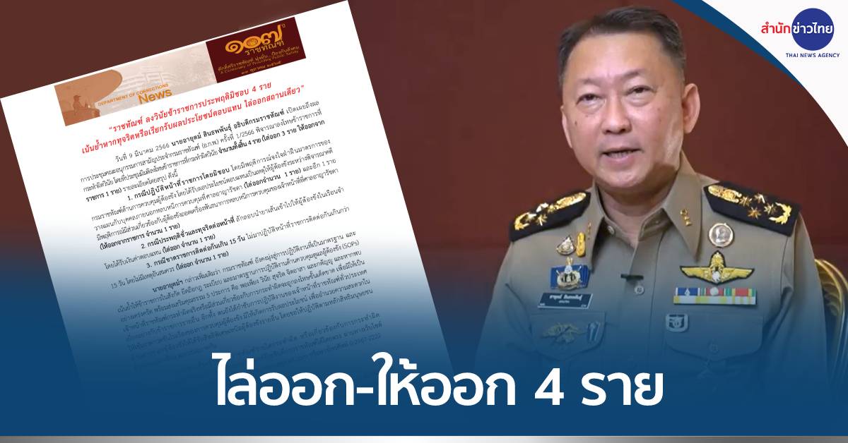 กรมราชทัณฑ์ 9 มี.ค.- กรมราชทัณฑ์ ลงวินัยข้าราชการประพฤติมิชอบ ไล่ออก-ให้ออกรวม 4 ราย มีทั้งเรียกรับประโยชน์ เกี่ยวข้องกับการที่ผู้ต้องขังหลบหนี ลอบนำยาเส้นเข้าไปให้ผู้ต้องขัง และขาดราชการติดต่อกันเกิน 15 วัน พร้อมเน้นย้ำหากทุจริตหรือเรียกรับผลประโยชน์ตอบแทน ไล่ออกสถานเดียว