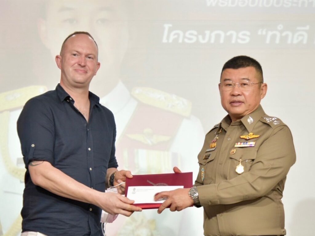 พล.ต.อ.ดำรงศักดิ์ กล่าวว่า จากเหตุการณ์เมื่อวันที่ 8 มี.ค.2566 เวลาประมาณ 04.00 น. เกิดอุบัติเหตุรถยนต์เก๋งเสียหลักชนเสาไฟฟ้า ก่อนไฟจะลุกท่วมรถ โดยมีคนขับและคนนั่งข้างติดอยู่ด้านในรถ บริเวณใกล้เคียงจุดกลับรถเทศบาลหนองตำลึง ถ.ศุขประยูร ม.6 ต.หนองตำลึง อ.พานทอง จ.ชลบุรี โดยพลเมืองดีทั้ง 4 ท่าน ได้แก่ Mr.Jurgen Adrianus Charles Christiaan, คุณนฤมล แน่นหนา, คุณเฉลิมชัย จูเจริญ และคุณสิทธิชัย พุทธเจริญ หยุดรถให้ความช่วยเหลือ ดึงร่างผู้บาดเจ็บออกมาได้ทัน ซึ่งสร้างความประทับใจและได้รับความชื่นชมจากสังคมเป็นอย่างมาก