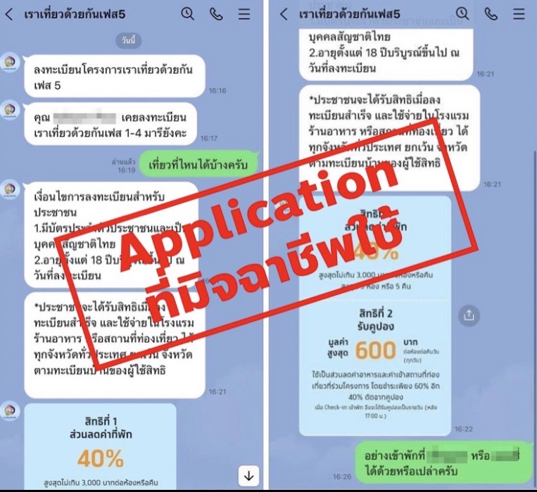 ตามที่ปรากฏในสื่อสังคมออนไลน์กรณีประชาชนหลายรายได้รับข้อความสั้น (SMS) จากหมายเลขโทรศัพท์ที่ไม่ทราบแหล่งที่มา แจ้งข้อความว่า “ โครงการเราเที่ยวด้วยกันเฟส 5 พร้อมลงทะเบียนรับสิทธิ์แล้ว เริ่ม 7 มีนาคม – 30 เมษายน 2566 ” พร้อมแนบลิงก์น่าสงสัยมากับข้อความดังกล่าว ซึ่งหากกดลิงก์แล้วจะเป็นการให้เพิ่มเพื่อนทางแอปพลิเคชันไลน์ปลอมชื่อ “ โครงการเราเที่ยวด้วยกันเฟส 5 ” มิจฉาชีพจะอ้างเป็นเจ้าหน้าที่ทำการสอบถามข้อมูลทั่วไปของเหยื่อ เช่น เคยลงทะเบียนมาก่อนหรือไม่ แจ้งเงื่อนไขการลงทะเบียน และแจ้งสิทธิส่วนลดต่างๆ ซึ่งเป็นการคัดลอกมาจากเว็บไซต์โครงการของจริง เพื่อสร้างความน่าเชื่อถือ ระหว่างนั้นจะส่งลิงก์ให้เหยื่อติดตั้งแอปพลิเคชันโครงการเราเที่ยวด้วยกันปลอม มีการขอสิทธิ์ติดตั้งแอปพลิเคชันที่ไม่รู้จัก (ไฟล์ที่อาจเป็นอันตราย หรือไฟล์นามสกุล .APK) ให้กรอกข้อมูลส่วนบุคคล หลอกลวงให้ตั้งรหัสผ่าน 6 หลัก จำนวนหลายๆ ครั้ง เพื่อหวังให้ผู้เสียหายกรอกรหัสชุดเดียวกับรหัสการเข้าถึง หรือทำธุรกรรมการเงินของแอปพลิเคชันธนาคารต่างๆ ในโทรศัพท์มือถือของเหยื่อ รวมไปถึงขอสิทธิ์ในการควบคุมอุปกรณ์ หรือโทรศัพท์มือถือ โดยในขั้นตอนนี้หากเหยื่อไม่สามารถทำด้วยตนเองได้ มิจฉาชีพจะแสร้งหวังดีสอนเหยื่อว่าจะต้องทำอย่างไร หรือในบางครั้งจะโทรไลน์มาบอกวิธีการด้วยตนเอง กระทั่งเมื่อมิจฉาชีพได้สิทธิ์ควบคุมอุปกรณ์หรือโทรศัพท์มือถือแล้ว จะทำการล็อกหน้าจอโทรศัพท์ทำให้เสมือนโทรศัพท์ค้าง โดยมักจะแสดงข้อความว่า อยู่ระหว่างดำเนินการตรวจสอบ ห้ามใช้งานโทรศัพท์มือถือ จากนั้นมิจฉาชีพจะนำรหัสที่เหยื่อเคยตั้งหรือกรอกไว้ก่อนหน้านี้ ทำการเข้าแอปพลิเคชันธนาคารแล้วโอนเงินไปยังบัญชีม้าที่เปิดรอไว้