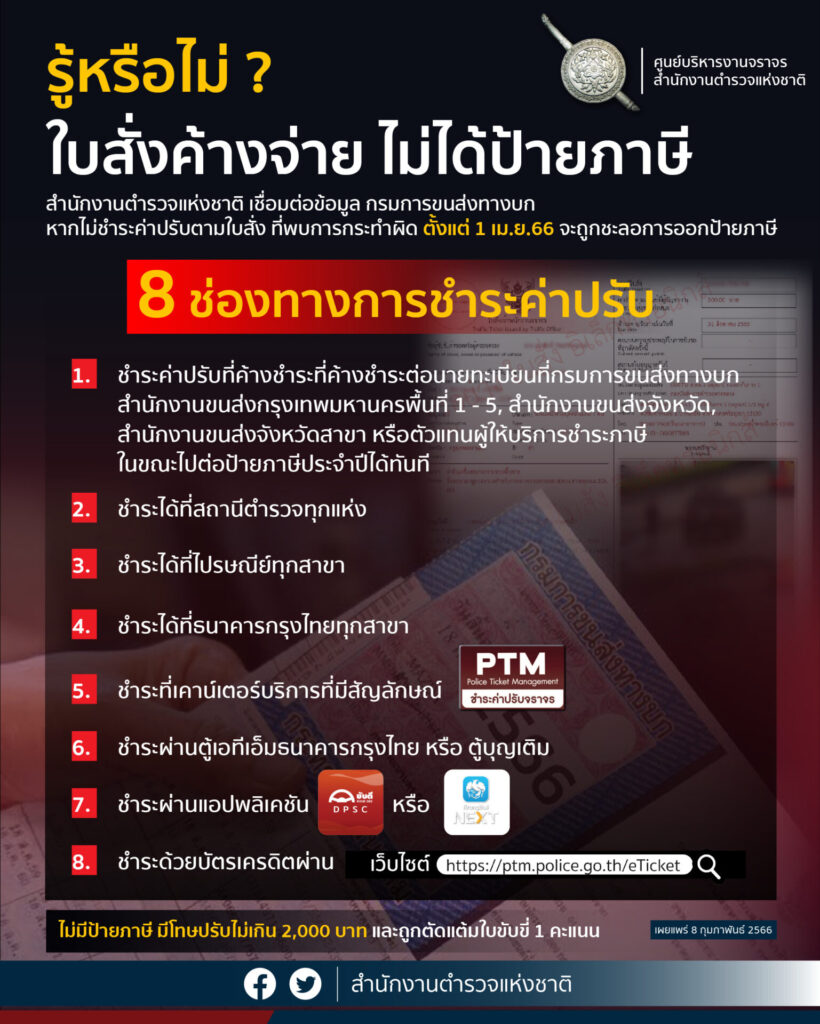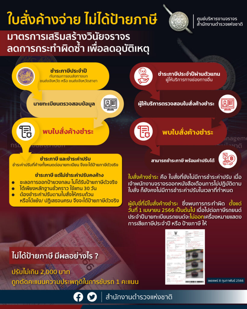 โฆษก ตร. กล่าวว่า “ขอย้ำเตือนผู้ขับขี่ที่มีใบสั่งค้างชำระ ตั้งแต่วันที่ 1 เมษายน 2566 เป็นต้นไป เมื่อไปต่อภาษีรถยนต์ประจำปี นายทะเบียนรถยนต์จะไม่ออกเครื่องหมายแสดงการเสียภาษีประจำปี หรือป้ายภาษี ให้ ผู้ขับขี่ที่ค้างชำระค่าปรับจะได้ใบแทนเสียภาษีชั่วคราว แทนใบจริง จนกว่าจะชำระค่าปรับให้ครบถ้วน ภายใน 30 วัน หลังรับใบแทน ซึ่งหากประชาชน ยังไม่ชำระค่าปรับ แล้วนำป้ายชั่วคราวไปใช้แทนป้ายภาษีเกิน 30 วัน จะถือว่าเป็นการขับรถโดยไม่มีป้ายภาษี จะมีโทษตาม พ.ร.บ.รถยนต์ มาตรา 11 มีโทษปรับไม่เกิน 2,000 บาท และยังจะถูกตัดคะแนนความประพฤติในการขับรถ 1 คะแนนเพิ่มอีกด้วย