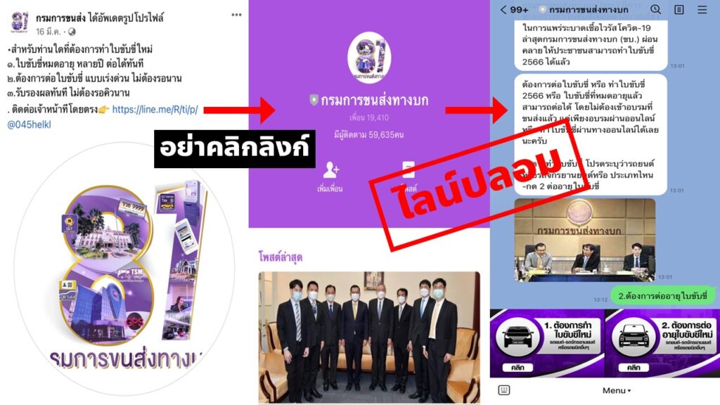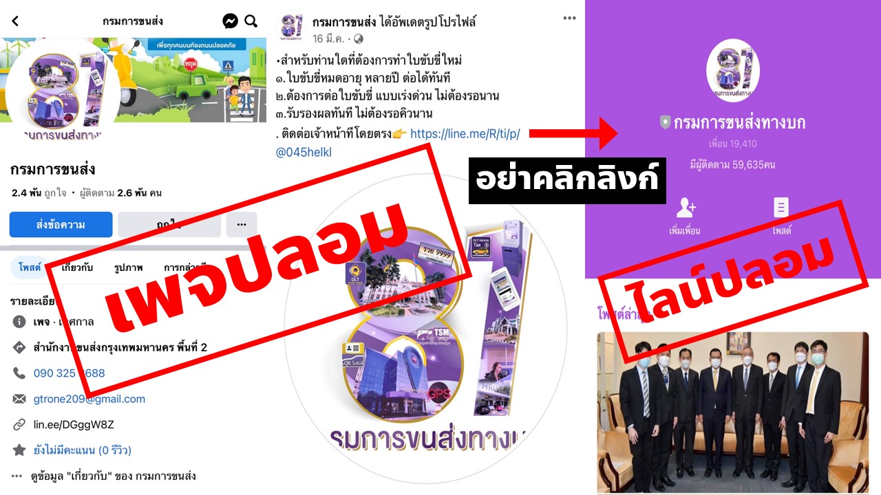 พ.ต.อ.กฤษณะ พัฒนเจริญ โฆษก บช.สอท. ขอประชาสัมพันธ์เตือนภัย มิจฉาชีพสร้างเพจเฟซบุ๊ก และไลน์ของกรมการขนส่งทางบกปลอม แอบอ้างเป็นเจ้าหน้าที่หลอกลวงให้ประชาชนโอนเงินค่าทำใบอนุญาตขับขี่ และต่ออายุใบอนุญาตขับขี่ยานพาหนะ ดังนี้