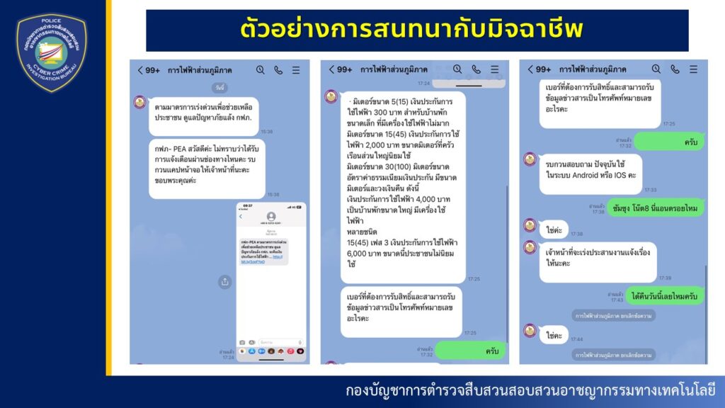 ได้รับรายงานจากกองบังคับการตรวจสอบและวิเคราะห์อาชญากรรมทางเทคโนโลยี (บก.ตอท.) ว่า พบผู้เสียหายหลายรายได้รับข้อความสั้น (SMS) จากมิจฉาชีพซึ่งแอบอ้างเป็นเจ้าหน้าที่การไฟฟ้าส่วนภูมิภาค (กฟภ.) แจ้งว่า ผู้เสียหายมีสิทธิได้รับเงินประกันการใช้ไฟฟ้าคืน เพื่อช่วยเหลือประชาชนตามมาตรการเร่งด่วน เมื่อผู้เสียหายกดลิงก์ที่แนบมากับข้อความดังกล่าว จะเป็นการเพิ่มเพื่อนทางแอปพลิเคชันไลน์ของการไฟฟ้าส่วนภูมิภาคที่มิจฉาชีพปลอมขึ้นมา จากนั้นมิจฉาชีพจะสอบถามรายละเอียดต่างๆ เริ่มจากสอบถามว่าได้รับการแจ้งเตือนมาจากช่องทางใด แจ้งผู้เสียหายว่าจะได้รับเงินประกันคืนในอัตราตั้งแต่ 2,000 – 6,000 บาท ขึ้นอยู่กับขนาดของมิเตอร์ที่ใช้ สอบถามว่าโทรศัพท์ที่ใช้งานใช้ระบบปฏิบัติการ Android หรือ IOS พร้อมทั้งขอหมายเลขโทรศัพท์เพื่อติดต่อกลับ เมื่อตอบคำถามเสร็จสิ้น จะมีหมายเลขโทรศัพท์ที่ไม่คุ้นเคยโทรมายังผู้เสียหาย อ้างเป็นเจ้าหน้าที่การไฟฟ้าส่วนภูมิภาค แล้วทำการส่งลิงก์ทางไลน์ให้ติดตั้งแอปพลิเคชันของการไฟฟ้าส่วนภูมิภาคปลอม อ้างว่าเป็นแอปพลิเคชันเวอร์ชันใหม่ล่าสุด สามารถตรวจสอบปริมาณไฟฟ้าที่ใช้ได้ในแต่ละวัน โดยมีการขอสิทธิ์ติดตั้งแอปพลิเคชันที่ไม่รู้จัก (ไฟล์อาจเป็นอันตราย หรือไฟล์นามสกุล .apk) มีการหลอกให้ตั้งรหัสผ่าน 6 หลัก จำนวนหลายๆ ครั้ง เพื่อหวังให้ผู้เสียหายกรอกรหัสชุดเดียวกับรหัสเข้าถึง หรือทำธุรกรรมการเงินของแอปพลิเคชันธนาคารต่างๆ ในโทรศัพท์มือถือของผู้เสียหาย รวมไปถึงขอสิทธิ์ในการควบคุมอุปกรณ์ หรือโทรศัพท์มือถือของเหยื่อ เช่น ดูและควบคุมหน้าจอ ดูและดำเนินการ เป็นต้น โดยในขั้นตอนนี้มิจฉาชีพจะแสร้งหวังดีสอนผู้เสียหายว่าทำอย่างไร โดยการโทรศัพท์มาแจ้งวิธีการด้วยตนเอง กระทั่งเมื่อมิจฉาชีพได้สิทธิ์ควบคุมอุปกรณ์หรือโทรศัพท์มือถือแล้ว จะทำการล็อกหน้าจอโทรศัพท์ ทำให้เสมือนโทรศัพท์ค้าง ซึ่งมักจะแสดงข้อความว่า อยู่ระหว่างดำเนินการตรวจสอบ ห้ามใช้งานโทรศัพท์มือถือ ทำให้มิจฉาชีพสามารถนำรหัสที่ผู้เสียหายเคยกรอกเอาไว้ก่อนหน้านี้ทำการโอนเงินออกจากบัญชีของผู้เสียหาย