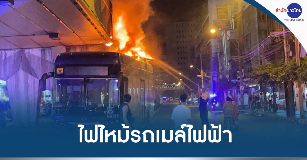 กทม. 9 เม.ย.-ไฟลุกไหม้หลังคารถเมล์ พลังงานไฟฟ้า สาย 38 สีน้ำเงิน ม.รามคำแหง 2 – อนุสาวรีย์ชัยสมรภูมิ พบจอดอยู่ใต้สะพานลอย ข้ามแยกประตูน้ำ ถนนเพชรบุรี เจ้าหน้าที่ใช้น้ำฉีดสกัด 30 นาที จึงควบคุมเพลิงได้