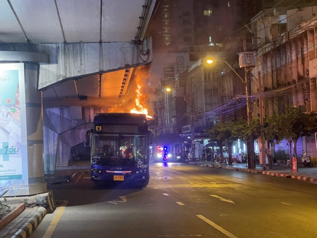 กลางดึก วันที่ 8 เม.ย.66 ตำรวจ สน.พญาไท รับแจ้งเหตุไฟไหม้รถประจำทาง บริเวณใต้สะพานลอยข้ามแยกประตูน้ำ ถนนเพชรบุรี เขตราชเทวี กทม. จึงประสานรถดับเพลิงจากสถานีดับเพลิงพญาไท และรถกู้ภัยมูลนิธิร่วมกตัญญู ก่อนรุดไปตรวจสอบ