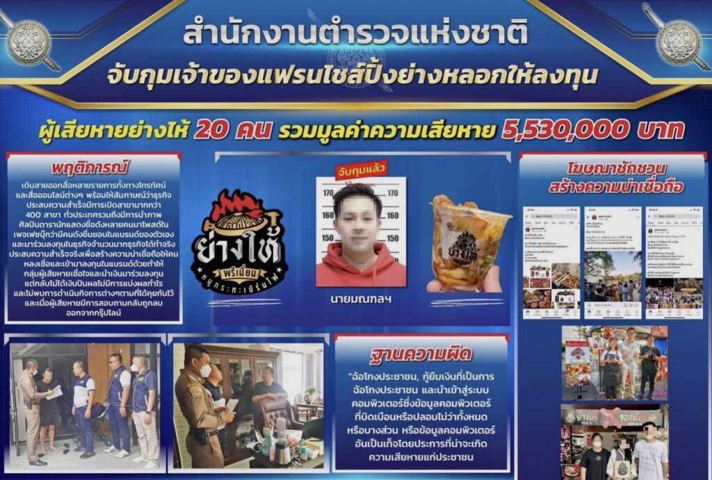 กรุงเทพฯ 19 เม.ย. – รวบเจ้าของแฟรนไชส์ปิ้งย่างชื่อดังหลอกลงทุน มีผู้เสียหาย 20 คน ตกเป็นเหยื่อ สูญเงินกว่า 5.5 ล้านบาท เชื่อทำเป็นการขบวนการ คาดมีผู้เสียหายเพิ่มอีก