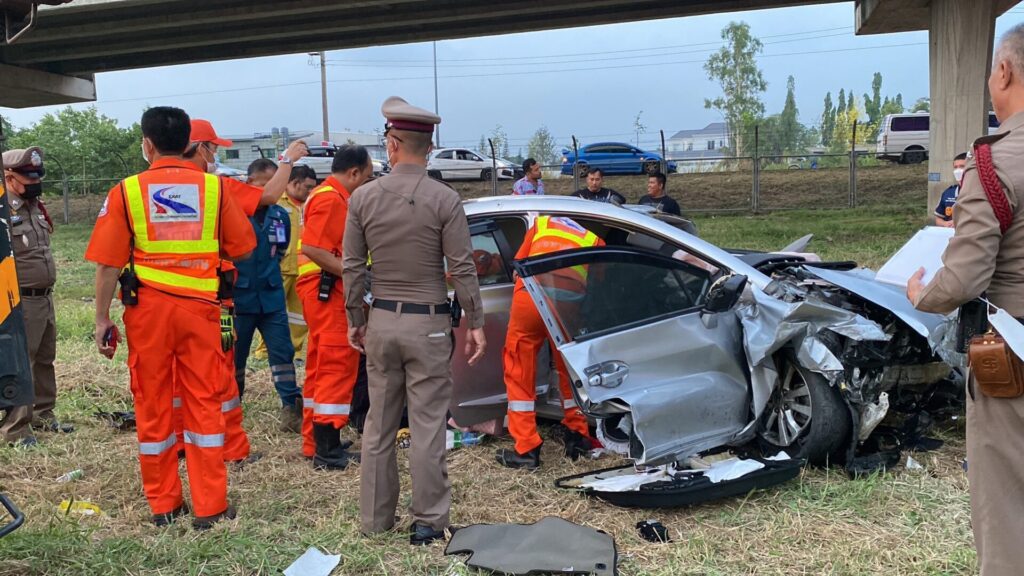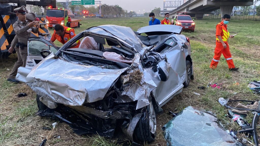 เมื่อเวลาประมาณ 04.20 น.ที่ผ่านมา ตำรวจ สน.คันนายาว สน.ทางด่วน 1 และเจ้าหน้าที่กู้ภัยมูลนิธิป่อเต็กตึ๊ง รับแจ้งอุบัติเหตุรถเก๋งตกทางด่วน จึงรุดไปตรวจสอบที่เกิดเหตุ บริเวณทางพิเศษฉลองรัช ช่วงทางขึ้นถนนจตุโชติ พบรถยนต์สีเทา กรุงเทพมหานคร เสียหลักตกลงมาจากทางด่วนในสภาพรถตีลังกา ล้อชี้ฟ้า พังยับเยิน พบคนติดอยู่ในรถเป็นหญิง 2 ราย เจ้าหน้าที่ป่อเต็กตึ๊งต้องใช้อุปกรณ์เครื่องตัดถ่างงัดประตูออกจึงนำร่างออกมาได้ โดยหญิงที่เป็นคนขับเสียชีวิตจากการถูกคอนโซลรถกดทับ ส่วนผู้โดยสารที่นั่งมาข้างคนขับได้รับบาดเจ็บสาหัส กู้ชีพนำส่งโรงพยาบาลภูมิพลโดยด่วน ทั้ง 2 คน ไม่ทราบชื่อ ไม่มีเอกสารติดตัว อายุประมาณ 20 – 30 ปี