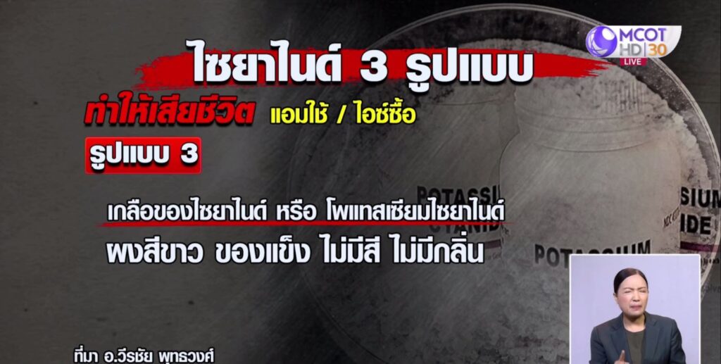 โดยสรุปคือ อาจารย์อ๊อด บอกว่า ตัวที่เป็นก๊าซ และเกลือ เป็นสารเคมีที่อันตรายถึงชีวิต แต่ตัวที่เป็นเกลือ หรือโพแทสเซียมไซยาไนด์ นั้น “แอมใช้ในการก่อเหตุ” และ “ไอซ์ ปรีชญา” ซื้อมาใช้กับสัตว์ .-สำนักข่าวไทย