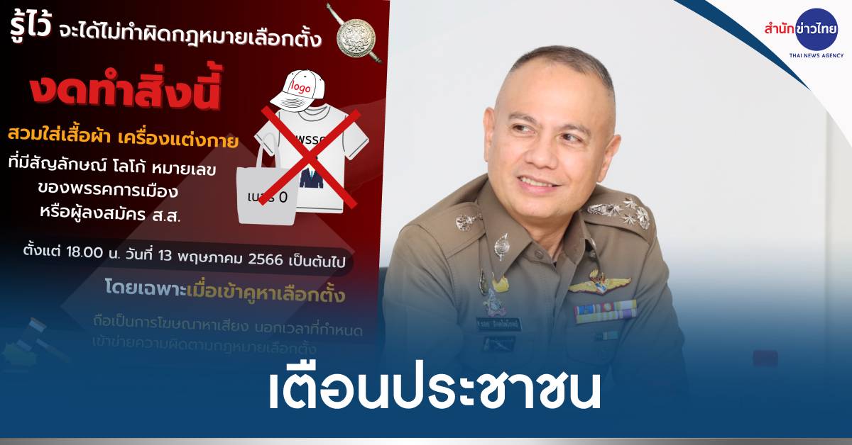 นอกจากนี้ ศลต.ตร. มีความห่วงใยพี่น้องประชาชน ตามที่กรมประชาสัมพันธ์ได้ประชาสัมพันธ์ให้พี่น้องประชาชนทราบ โดยเน้นย้ำในเรื่องของการงดเว้นแสดงสัญลักษณ์ที่เข้าข่ายเป็นการโฆษณาหาเสียง โดยการสวมใส่เสื้อผ้า เครื่องแต่งกาย กระเป๋า หมวก ที่มีโลโก้ หมายเลข สัญลักษณ์พรรคการเมือง หรือผู้สมัคร ส.ส. ตั้งแต่เวลา 18.00 น. ของวันที่ 13 พฤษภาคม 2566 โดยเฉพาะเมื่อเข้าไปในบริเวณหน่วยเลือกตั้ง และคูหาเลือกตั้ง เพราะอาจถือเป็นการโฆษณาหาเสียง เข้าข่ายผิดกฎหมายเลือกตั้ง มีโทษจำคุกไม่เกิน 6 เดือน และปรับไม่เกิน 10,000 บาท หรือทั้งจำทั้งปรับ
