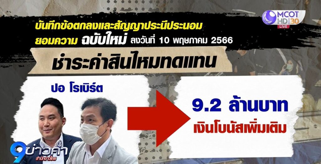 วันนี้ปอกับโรเบิร์ตได้ให้ความร่วมมือเซ็นสัญญาประนีประนอมยอมความฉบับใหม่ ลงวันที่ 10 พฤษภาคม 2566 ซึ่งมีการชำระเงินก้อนมาก่อนหน้านี้เเล้วจำนวน 9.2 ล้านบาท และจะมีการจ่ายเงินโบนัสพิเศษทุกปีให้กับคุณแม่ของแตงโม แต่ขอไม่ระบุตัวเลข ซึ่งวันนี้คุณแม่พอใจในเงินก้อนดังกล่าว จึงมาเซ็นสัญญาต่อหน้าศาลด้วย