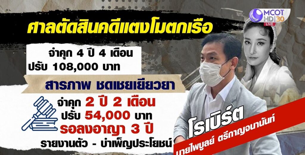 จำเลยที่ 2 คือ นายไพบูลย์ ตรีกาญจนานันท์ หรือโรเบิร์ต ศาลมีคำพิพากษาตัดสินจำคุกเป็นเวลา 4 ปี 4 เดือน และให้ปรับเป็นเงิน 108,000 บาทถ้วน แต่จำเลยที่ 2 มีเจตนาเยียวยาชดเชยค่าสินไหมทดแทนให้กับผู้เสียหายจนเป็นที่พอใจ จึงลดโทษให้กับจำเลยที่ 2 เป็นจำคุก 2 ปี 2 เดือน ปรับ 54,000 บาทถ้วน โดยรอลงอาญาหรือให้รอการลงโทษเป็นเวลา 3 ปี และให้รายงานตัวบำเพ็ญประโยชน์แก่สังคมและสาธารณะ.
