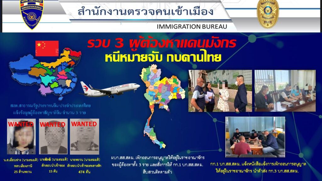 กรุงเทพฯ 23 พ.ค. – ตำรวจตรวจคนเข้าเมืองจับ 4 ผู้ต้องหาชาวจีน หนีหมายจับกบดานไทย พบ 1 รายเป็นแก๊งคอลเซ็นเตอร์รายใหญ่ หลอกลงทุนแชร์ลูกโซ่กว่า 100,000 ล้านบาท