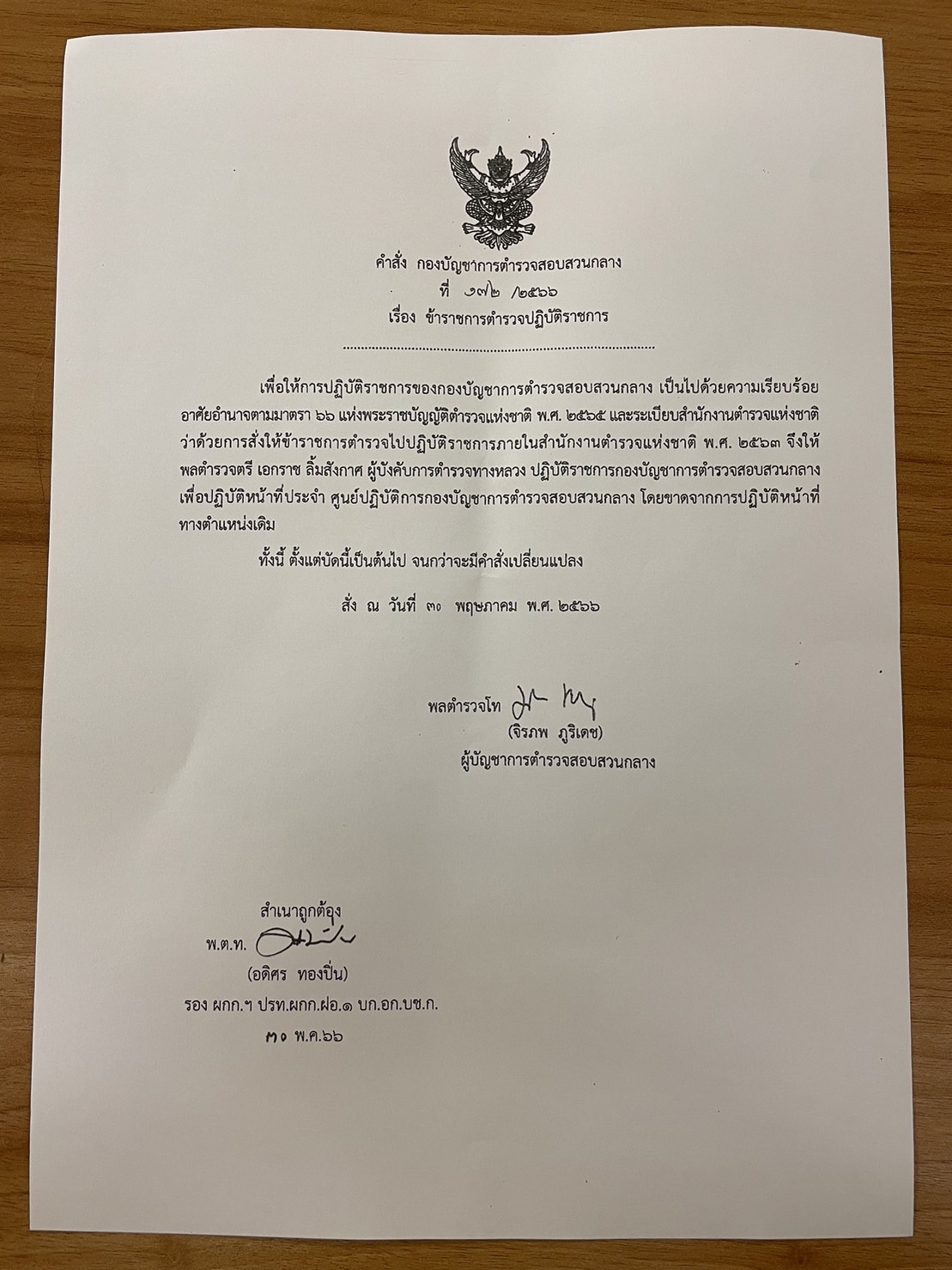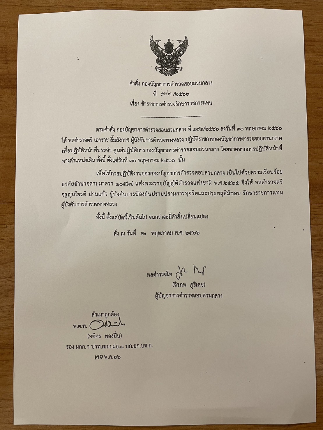 วันนี้ (30 พ.ค.66) พล.ต.ท.จิรภพ จึงได้ลงนามในคำสั่งกองบัญชาการตำรวจสอบสวนกลาง ที่ 172/2566 เพื่อให้ผู้บังคับการตำรวจทางหลวง มาปฏิบัติราชการที่ศูนย์ปฏิบัติการ กองบัญชาการตำรวจสอบสวนกลาง (ศปก.บช.ก.) จนกว่าการตรวจสอบข้อเท็จจริงจะเสร็จสิ้น พร้อมกับลงนามในคำสั่งให้ พล.ต.ต.จรูญเกียรติ ปานแก้ว ผู้บังคับการกองบังคับการป้องกันปราบปรามการทุจริตและประพฤติมิชอบ (บก.ปปป.) รักษาราชการแทนผู้บังคับการตำรวจทางหลวง อีกตำแหน่งหนึ่ง