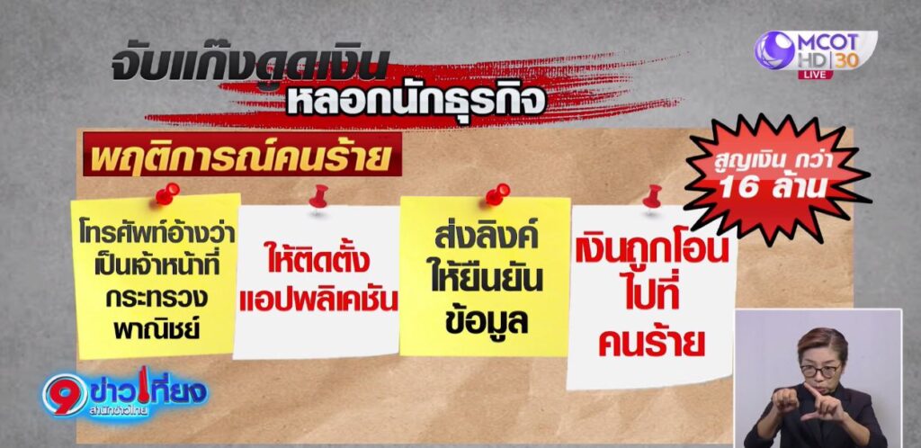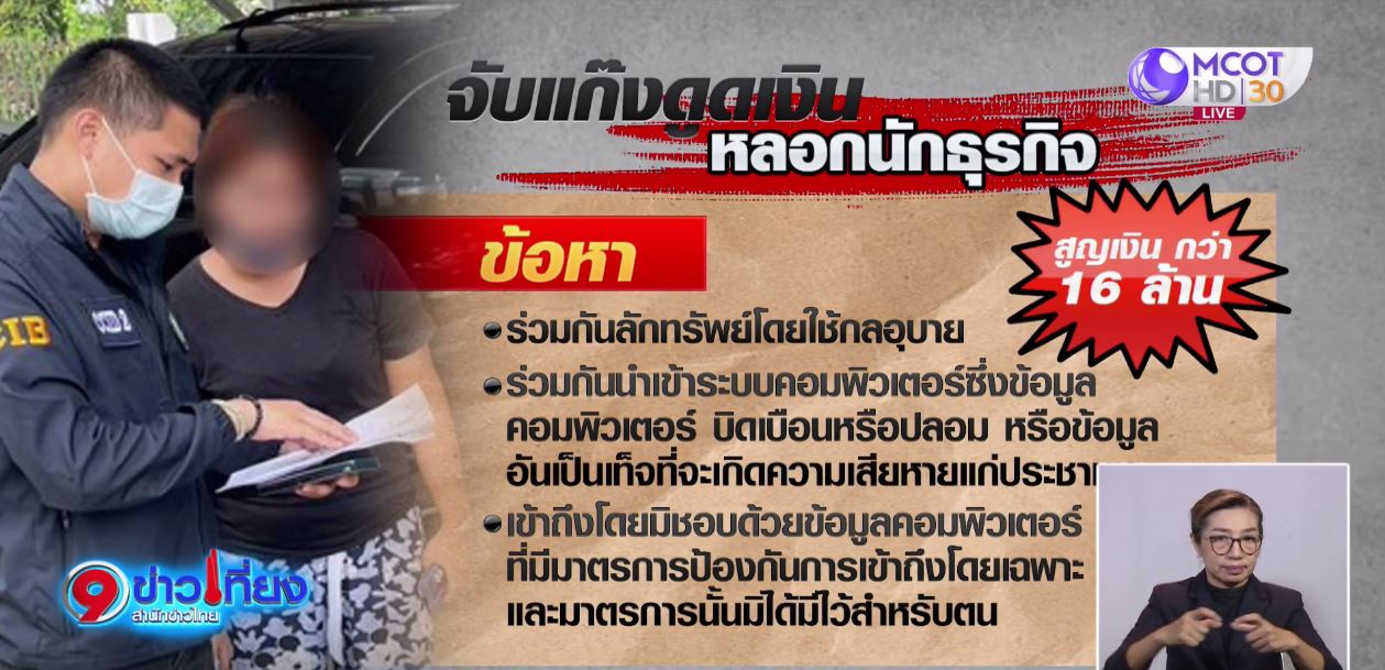 31 พ.ค. – ตำรวจไซเบอร์รวบสาวบัญชีม้า ร่วมแก๊งหลอกนักธุรกิจ อ้างเป็นเจ้าหน้าที่กรมทะเบียนธุรกิจการค้า ให้ผู้เสียหายติดตั้งแอปฯ ก่อนดูดเงิน สูญกว่า 16 ล้าน