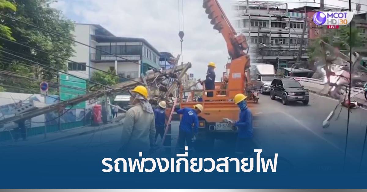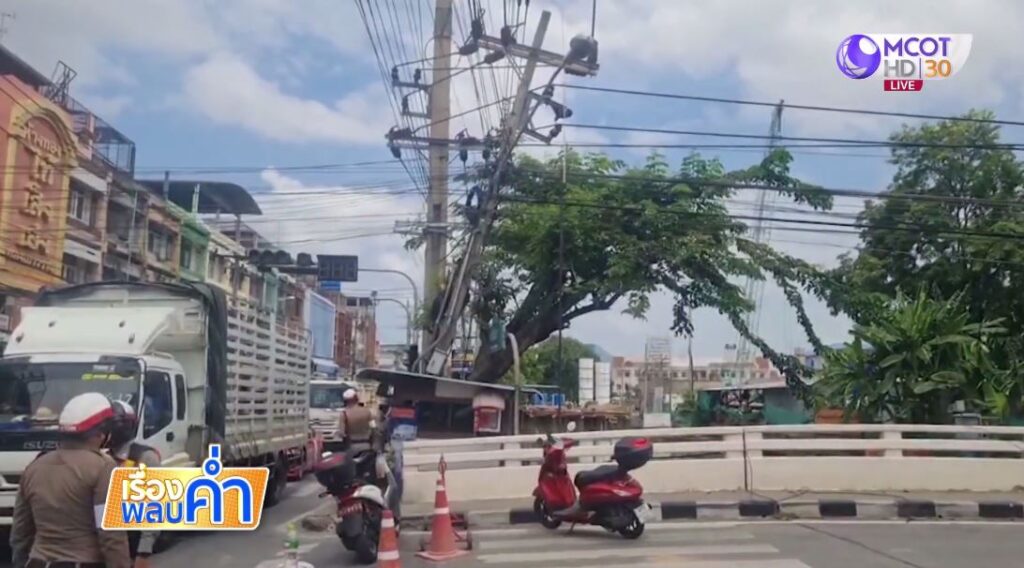 กทม. 8 มิ.ย. – รถพ่วง 18 ล้อ บรรทุกเครื่องผสมปูน เกี่ยวสายไฟหน้าไซต์งานโครงการก่อสร้างอุโมงค์ระบายน้ำคลองทวี ใกล้แยกคลองขวาง ทำเสาไฟฟ้าล้ม 7 ต้น มี 1 ต้น ทับป้อมตำรวจจราจร สน.เพชรเกษม เส้นบางบอน 3 ไฟดับทั้งหมด รถติดหนัก เจ้าหน้าที่การไฟฟ้าเร่งแก้ไข ตั้งเสาใหม่
