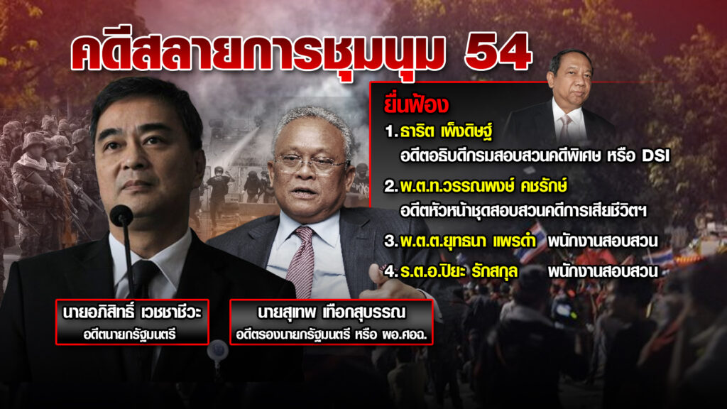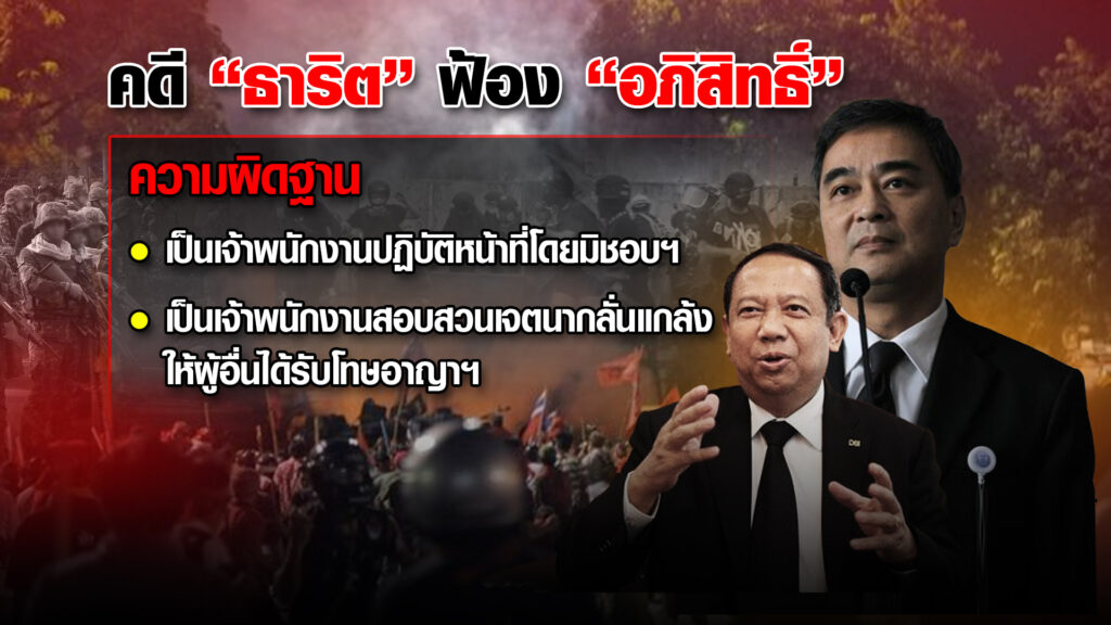 เมื่อวันที่ 16 มิถุนายน ที่ห้องพิจารณา 902 ศาลอาญา ถนนรัชดาภิเษก ศาลนัดฟังคำพิพากษาศาลฎีกา ครั้งที่ 9 คดีปฏิบัติหน้าที่มิชอบ หมายเลขดำ อ.310/2556 ที่ อภิสิทธิ์ เวชชาชีวะ อดีตนายกรัฐมนตรี และ สุเทพ เทือกสุบรรณ อดีตรองนายกรัฐมนตรี ในฐานะผู้อำนวยการศูนย์อำนวยการแก้ไขสถานการณ์ฉุกเฉิน (ผอ.ศอฉ.) ร่วมกันเป็นโจทก์ยื่นฟ้อง ธาริต เพ็งดิษฐ์ อดีตอธิบดีกรมสอบสวนคดีพิเศษ (DSI), พ.ต.ท. วรรณพงษ์ คชรักษ์ อดีตหัวหน้าชุดสอบสวนคดีการเสียชีวิตของประชาชน และเจ้าหน้าที่รัฐ จากเหตุรุนแรงทางการเมืองปี 2553, พ.ต.ต. ยุทธนา แพรดำ และ ร.ต.อ. ปิยะ รักสกุล ในฐานะพนักงานสอบสวน เป็นจำเลยที่ 1-4 ในความผิดฐานเป็นเจ้าพนักงานปฏิบัติหน้าที่โดยมิชอบหรือโดยทุจริต และเป็นเจ้าพนักงานสอบสวนกระทำการโดยมีเจตนากลั่นแกล้งให้ผู้อื่นได้รับโทษอาญา ตามประมวลกฎหมายอาญา มาตรา 157 และ 200 วรรคสอง กรณีนายธาริตกับพวกแจ้งข้อหาดำเนินคดีนายอภิสิทธิ์และนายสุเทพ ฐานสั่งฆ่าประชาชน ในการสลายม็อบ นปช.เมื่อปี 53 จำเลยทั้งสี่ ให้การปฏิเสธต่อสู้คดี