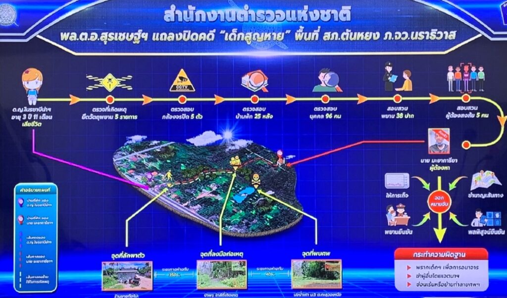 พล.ต.อ.สุรเชษฐ์ เปิดเผยว่า คดีนี้ตำรวจสืบสวนจากกล้องวงจรปิดบริเวณที่เกิดเหตุทำให้ทราบว่าช่วงเกิดเหตุ ประมาณวันที่ 14 พ.ค.66 ผู้ตายถูกลักพาตัวไป ปรากฏภาพชายไม่ทราบชื่อ สวมเสื้อสีขาวอุ้มเอาตัวผู้ตายไป หลังเกิดเหตุเจ้าหน้าที่ลงพื้นที่ตรวจสอบบ้าน 24 หลัง สอบปากคำผู้เกี่ยวข้อง 96 คน ทำให้สามารถคัดแยกผู้ต้องสงสัยได้ 6 คน และเชิญตัวมาซักถามข้อมูล ซึ่งผู้ต้องสงสัย 5 คน ยืนยันสถานที่อยู่ขณะเกิดเหตุกับเจ้าหน้าที่ได้ มีเพียงนายมะยาการียา คนเดียวไม่สามารถยืนยันสถานที่อยู่ขณะเกิดเหตุได้