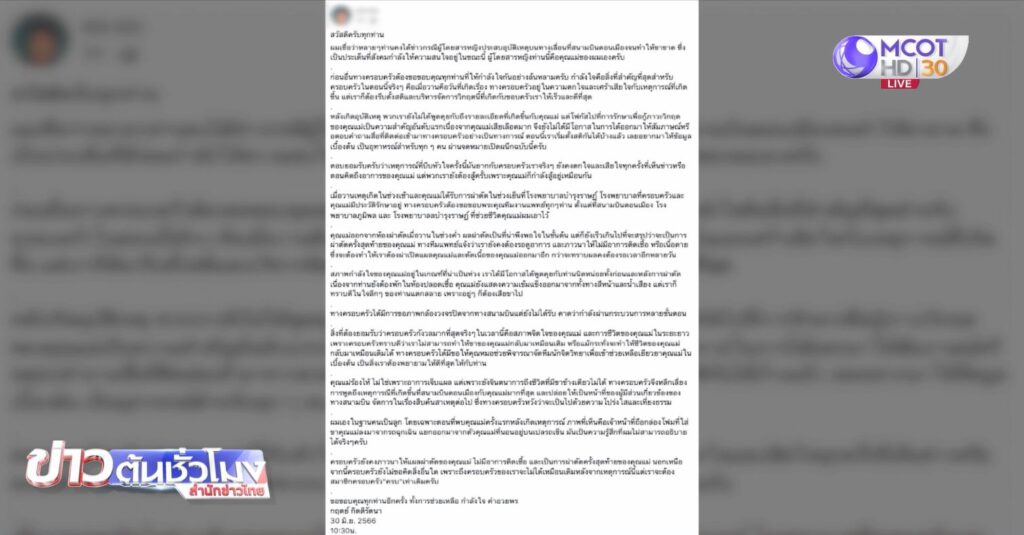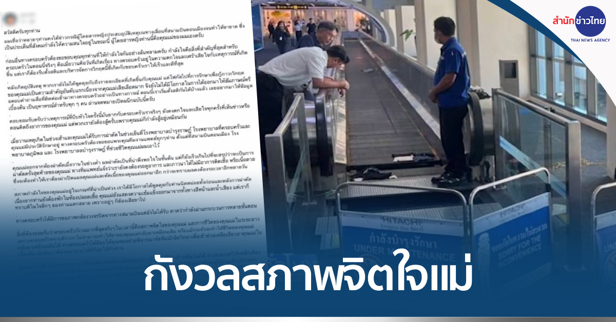 30 มิ.ย. – ลูกชายห่วงสภาพจิตใจแม่ หลังถูกทางเลื่อนสนามบินดอนเมืองดูดขา ขอทีมจิตวิทยาดูแล เผยผลผ่าตัดน่าพอใจในขั้นต้น แต่ยังต้องรอดูอาการ