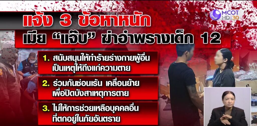ด้าน พ.ต.อ.อนันต์ วรสาตร์ ผู้กำกับการ สน.บางเขน บอกว่า แม้ผู้ต้องหาจะปฏิเสธทำแผนฯ แต่ตำรวจมีหลักฐานเพียงพอ โดยเฉพาะภาพจากกล้องวงจรปิดในที่เกิดเหตุ พบว่ามิ้นท์ ภรรยาของนายแจ๊บ มีพฤติกรรมร่วมกันอำพรางศพด้วย ส่วนเรื่องปมการติดพนันออนไลน์ของมิ้นท์ และเรื่องที่กล่าวอ้างว่าเด็กขโมยเงินหลักแสนไปเล่นพนันออนไลน์นั้น ตำรวจจะเร่งตรวจสอบข้อมูลอย่างละเอียดอีกครั้ง . – สำนักข่าวไทย