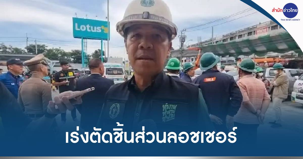 นายธวัชชัย สมบูรณ์ รองผู้อำนวยการสำนักการโยธา กรุงเทพมหานคร เปิดเผยแผนการเคลื่อนย้ายซากโครงเหล็ก หรือลอชเชอร์ออกจากที่เกิดเหตุ ซึ่งเป็นอุปกรณ์ในการยกดึง และเคลื่อนแผ่นปูนสำหรับทำผิวสะพานออกจากที่เกิดเหตุว่า โดยลอชเชอร์มีควายาวด้านละ 110 เมตร น้ำหนักข้างละ 150 ตัน จะใช้วิธีการตัดทอนเป็นท่อนลักษณะเหมือนตัดชิ้นเค้ก โดยเริ่มตัดจากส่วนหัว และส่วนท้ายของลอชเชอร์ก่อนความยาวท่อนละ 7 เมตร น้ำหนักท่อนละ 7 ตัน ส่วนตัวลอชเชอร์ จะตัดซอยท่อนละ 12 เมตร น้ำหนักท่อนละ 30 ตัน และจะใช้เครน 200 ตัดพยุงและยกออกจากพื้นที่ ซึ่งต้องระวังการดีดตัวของเหล็กเนื่องจากเป็นการถล่มที่ชิ้นส่วนเหล็กทับซ้อนกันอยู่ โดยขณะนี้ตัดส่วนหัวและท้ายเสร็จแล้วรอการเคลื่อนย้ายในช่วงเวลากลางคืนเพื่อความปลอดภัย และบางส่วนต้องนำไปเก็บไว้เพราะเป็นหลักฐานทางคดี คาดว่าใช้เวลาเคลียร์ลอชเชอร์ออกจากที่เกิดเหตุ 3 วัน เพื่อเปิดผิวการจราจร พร้อมเผยช่วงบ่ายจะเริ่มจ่ายกระแสไฟฟ้าให้กับประชาชนและผู้ประกอบการในพื้นที่