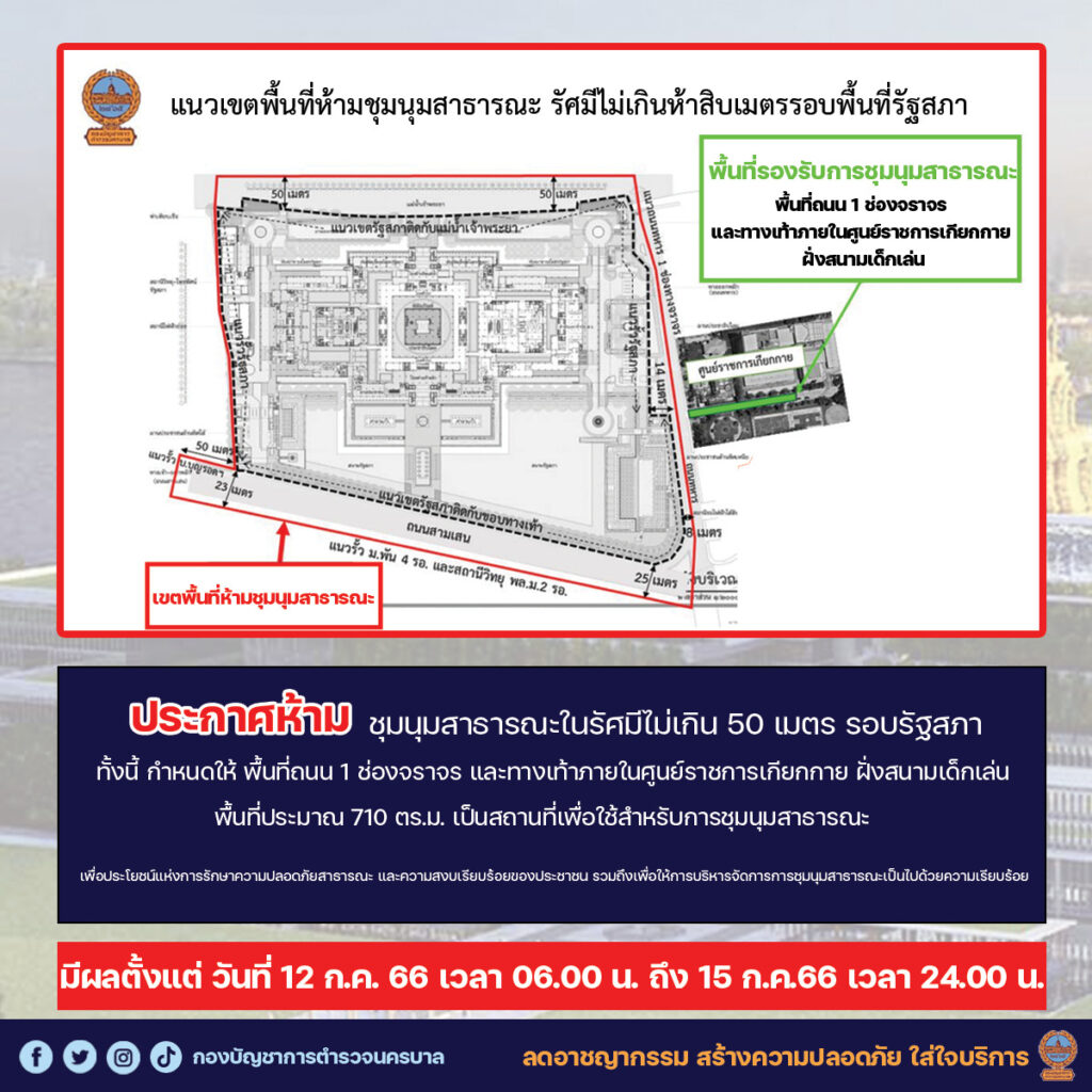 โดย พล.ต.ท.ธิติ แสงสว่าง ผบช.น. ได้ลงนามคำสั่ง กองบัญชาการตำรวจนครบาล ที่ 315/2566 เรื่อง ประกาศห้ามชุมนุมสาธารณะในรัศมีไม่เกิน 50 เมตร รอบรัฐสภา ตามมาตรา 7 วรรคท้าย แห่งพระราชบัญญัติการชุมนุมสาธารณะ พ.ศ.2558 โดยประกาศห้ามชุมนุมสาธารณะในรัศมีไม่เกิน 50 เมตร รอบรัฐสภา รายละเอียดกำหนดพื้นที่ห้ามชุมนุมและพื้นที่ชุมนุมรอบรัฐสภา ทั้งนี้ ตั้งแต่วันที่ 12 กรกฎาคม 2566 เวลา 06.00 น. ถึงวันที่ 15 กรกฎาคม 2566 เวลา 24.00 น. ซึ่งอาจมีการปิด ปรับเปลี่ยนเส้นทางการจราจร เพื่ออำนวยความสะดวกในการดูแลการชุมนุมฯ