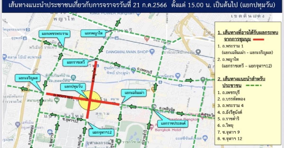 กรุงเทพฯ 21 ก.ค. – บช.น. แนะนําประชาชนหลีกเลี่ยงเส้นทางการชุมนุมทั่วกรุงเทพฯ 5 จุด วันนี้ ซึ่งอาจส่งผลกระทบการจราจร