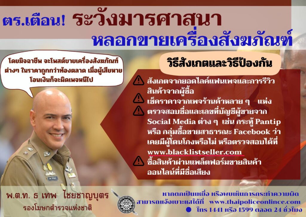พ.ต.ท. ธ เทพ กล่าวว่า ด้วยวันที่ 1-2 สิงหาคมนี้ เป็นวันอาสาฬหบูชาและวันเข้าพรรษา ซึ่งเป็นวันสำคัญทางศาสนาพุทธ พุทธศาสนิกชนตลอดจนพระภิกษุสงฆ์ ต่างซื้อหาเครื่องสังฆภัณฑ์ ซึ่งเป็นเครื่องประกอบการพิธีทางศาสนาดังกล่าวเป็นจำนวนมาก จึงเป็นโอกาสของมิจฉาชีพที่จะสวมรอยหลอกขายเครื่องสังฆภัณฑ์ สร้างความเดือดร้อนแก่ประชาชนและพระภิกษุสงฆ์ จึงขอให้พี่น้องประชาชนกรุณาใช้ความรอบคอบ ระมัดระวังในการซื้อหาสินค้าทางออนไลน์ ดังนี้ คือ สังเกตยอดไลก์แฟนเพจ การรีวิวได้รับสินค้าจากผู้ซื้อต่าง ๆ เช็กราคาจากเพจร้านค้าหลายๆ เพจ ว่าราคาใกล้เคียงกันหรือไม่ ตรวจสอบรายชื่อและเลขที่บัญชีผู้ขายจากเพจโซเชียลมีเดียต่าง ๆ เช่น กระทู้พันทิป เว็บไซต์ blacklistseller.com หรือกลุ่มซื้อขายสาธารณะต่างๆ ว่าเคยมีผู้โดนโกงหรือไม่ หรือซื้อสินค้าผ่านแพล็ตฟอร์มหรือเว็บไซต์ขายสินค้าออนไลน์ที่มีมาตรฐานหรือมีชื่อเสียง