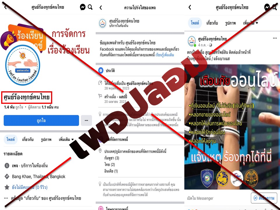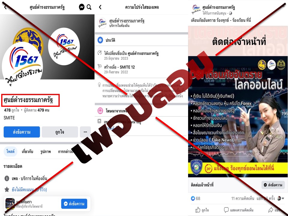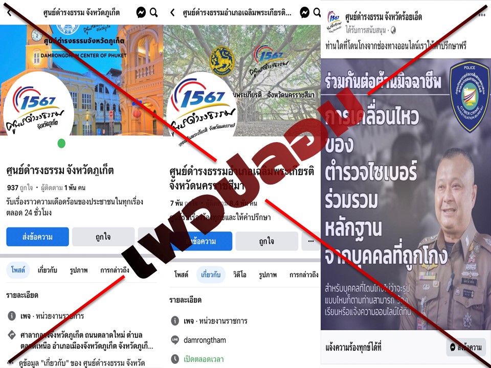 พ.ต.อ.กฤษณะ พัฒนเจริญ โฆษก บช.สอท. กล่าวว่าได้รับการประสานงานจากศูนย์ดำรงธรรม กระทรวงมหาดไทย และจากการตรวจสอบในระบบศูนย์บริหารการแจ้งความออนไลน์ พบผู้เสียหายหลายรายถูกมิจฉาชีพหลอกลวงเอาข้อมูลส่วนบุคคล และหลอกลวงให้โอนเงินเป็นค่าทนายความ เนื่องจากผู้เสียหายได้ติดต่อไปยังเพจเฟซบุ๊กของรัฐปลอมต่างๆ ซึ่งจากการตรวจสอบเบื้องต้นพบเพจปลอม ดังนี้ 1.เพจศูนย์ดำรงธรรมภาครัฐ 2.เพจศูนย์ร้องทุกข์คนไทย 3.เพจศูนย์ช่วยเหลือประชาชน 4.เพจศูนย์ดำรงธรรมเคลื่อนที่ 5.ศูนย์เพจดำรงธรรมจังหวัดต่างๆ ซึ่งเพจเหล่านี้ได้ถูกมิจฉาชีพสร้างขึ้นมาเพื่อหลอกลวงประชาชน มีการใช้ตราสัญลักษณ์ของหน่วยงานราชการ ไม่ว่าจะเป็น ตราสัญลักษณ์ของตำรวจ บช.สอท., กระทรวงมหาดไทย, ศูนย์ดำรงธรรม และสภาทนายความ เพื่อสร้างความน่าเชื่อถือ นอกจากนี้ภายในเพจลักษณะดังกล่าวยังมีการนำรูปภาพและข้อความที่ถูกคัดลอก หรือถูกตัดต่อมาจากเพจของหน่วยงานรัฐจริงมาใช้แจ้งเตือนภัยออนไลน์ต่างๆ แสร้งหวังดีประสงค์ร้ายต่อผู้เสียหาย ต่อมาเมื่อมีประชาชนติดต่อเข้าไปทาง Facebook Messenger มิจฉาชีพจะสอบถามข้อมูลเบื้องต้นว่าถูกหลอกลวงเรื่องใด ความเสียหายเท่าใด พร้อมขอหลักฐานที่เกี่ยวข้อง เช่น ข้อมูลส่วนตัว ข้อมูลทางการเงิน หลักฐานการพูดคุยกับคนร้าย หลักฐานการโอนเงิน เป็นต้น จากนั้นจะให้เพิ่มเพื่อนทางแอปพลิเคชันไลน์เพื่อไปติดต่อกับทนายความปลอม ที่อ้างว่าสามารถช่วยเหลือ และติดตามเร่งรัดคดีที่ผู้เสียหายเคยตกเป็นเหยื่อได้ แต่ต้องโอนเงินค่าทนายมาให้ก่อนถึงจะได้รับความช่วยเหลือ เมื่อผู้เสียหายหลงเชื่อโอนเงินไปแล้วก็จะถูกตัดขาดการติดต่อ โดยมิจฉาชีพอาจจะนำข้อมูลที่ได้ไปแสวงหาผลประโยชน์โดยมิชอบ ไม่ว่าจะเป็นการนำข้อมูลไปแฮ็กบัญชีสื่อสังคมออนไลน์แล้วไปหลอกยืมเงินผู้อื่น หรือโอนเงินจากบัญชีธนาคาร หรือนำข้อมูลไปขายให้กับแก๊งมิจฉาชีพคอลเซ็นเตอร์ หรือนำไปแอบอ้างทำเรื่องที่ผิดกฎหมายต่างๆ เป็นต้น