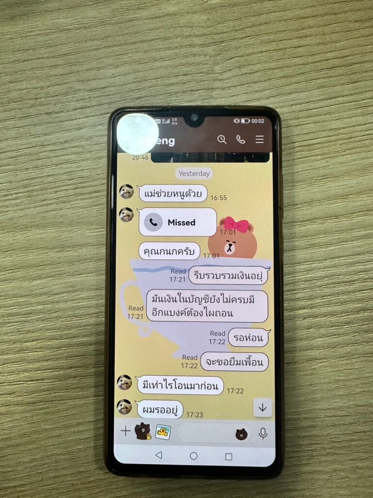ส่วนคนร้ายอีกทีม จะโทรติดต่อแม่ของน้องด้วยไลน์ของน้อง ซึ่งน้องได้ให้รหัสคนร้ายไว้ จึงทำให้แม่เชื่อว่าลูกสาวอยู่กับคนร้าย และตกอยู่ในอันตราย โดยคนร้ายขู่จะตัดนิ้วของน้อง ถ้าแม่ไม่โอนเงิน จำนวน 3 ล้านบาทเข้าบัญชีของน้อง