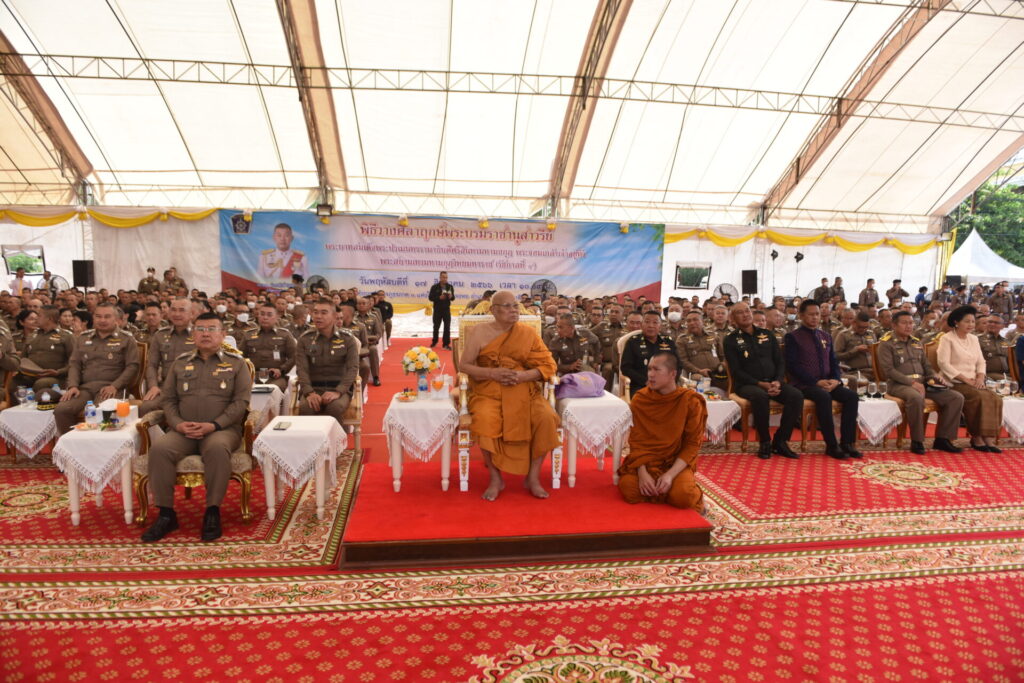 ผบ.ตร.ไปยังลานพิธี ทำทำพิธีบวงสรวง ต่อด้วยพิธีสงฆ์ โดยพระพรหมวชิรนายก ที่ปรึกษาเจ้าคณะภาค 11 และเจ้าอาวาสวัดพระนารายณ์มหาราชวรวิหาร ประธานฝ่ายสงฆ์ พร้อมคณะสงฆ์ ร่วมสวดเจริญพระพุทธมนต์ ผบ.ตร.ประกอบพิธีเจิมแผ่นศิลาฤกษ์ ไม้มงคล 9 แท่ง แผ่นอิฐเงิน อิฐทอง อิฐนาถ ถวายพระพรหมวชิรนายก เพื่อเจิม พร้อมปิดแผ่นทอง วางแผ่นศิลาฤกษ์ วางตลับนพรัตน์ลงบนศิลาฤกษ์ วางพวงมาลัย โปรยดอกไม้ เหรียญเงินเหรียญทองลงแผ่นศิลาฤกษ์ พระสงฆ์เจริญชัยมงคลคาถา จากนั้น ผบ.ตร. พร้อมพระพรหมวชิรนายก และผู้บังคับบัญชา ร่วมพิธีเปิดหอพระพุทธตรีวิสุทธิธรรมประชานาถ ต่อด้วยพิธีทำบุญอุทิศทักษิณานุประทาน เป็นอันเสร็จพิธี