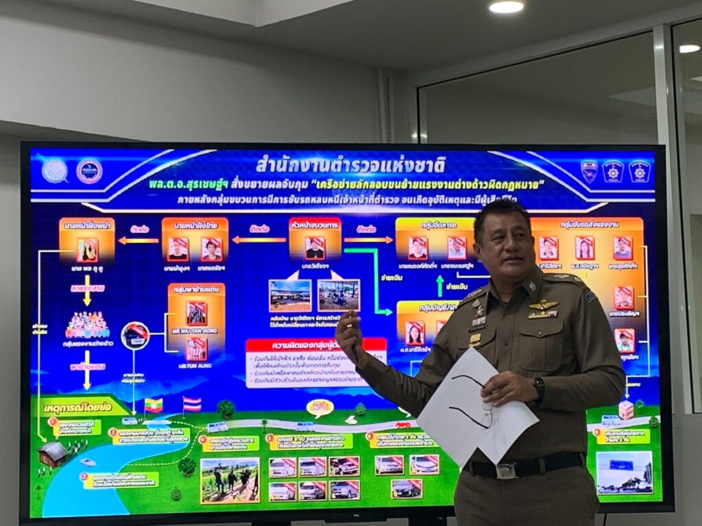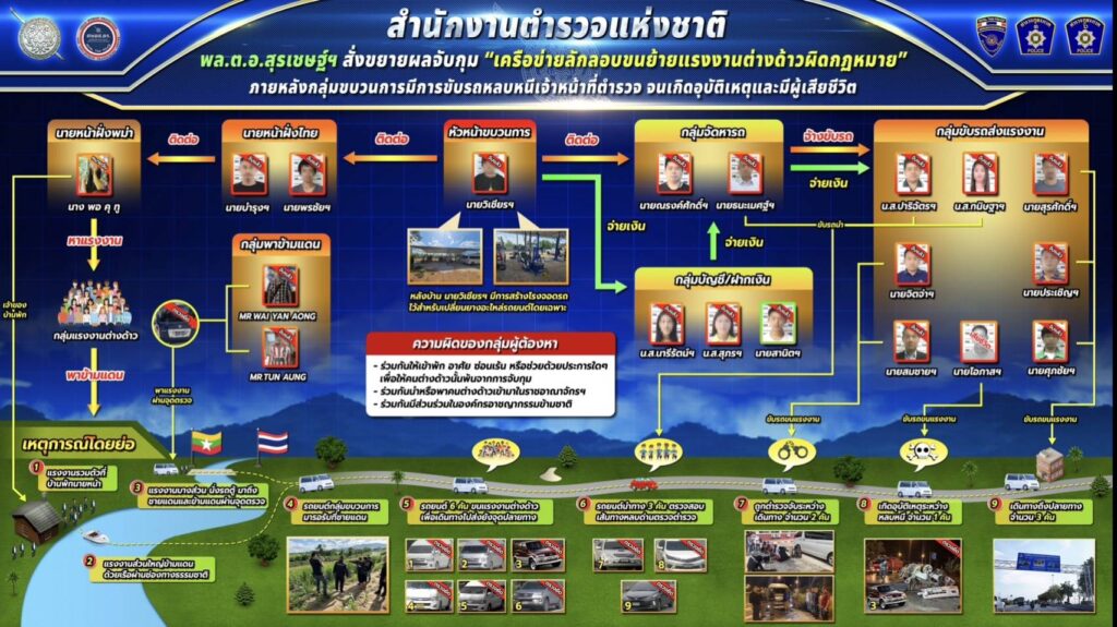 และจากการตรวจสอบพฤติการณ์ พบว่าเป็นเครือข่ายเดียวกัน มีการแบ่งหน้าที่กันทำ เช่น นายหน้าฝั่งเมียนมา, นายหน้าฝั่งไทย, กลุ่มพาข้ามแดน, กลุ่มจัดหารถ, กลุ่มขับรถส่งแรงงาน, กลุ่มบัญชี/ฝากเงิน ส่วนใหญ่จะเข้ามาทำงานตามโรงงานในพื้นที่ภาคกลาง จึงมีการสืบสวน รวบรวมหลักฐานออกหมายจับบุคคลที่เกี่ยวข้องทั้งหมดทั้งสิ้น 18 คน มีการแจ้งข้อกล่าวหา 16 คน ส่วนอีก 2 คน เป็นเยาวชน 1 คน และเสียชีวิต 1 คน โดยมีการแบ่งหน้าที่กันทำ ส่วนผู้ต้องหาคนสำคัญอีก 1 คน คือ นางพอ คุ ทู พบเป็นนายหน้าเมียนมา ที่เป็นจุดเริ่มต้นในนการจัดหาแรงงานในเมียนมาส่งขบวนการเดินข้ามชายแดนมาไทย อยู่ระหว่างประสานทางการเมียนมาดำเนินการจับกุมมาดำเนินคดี