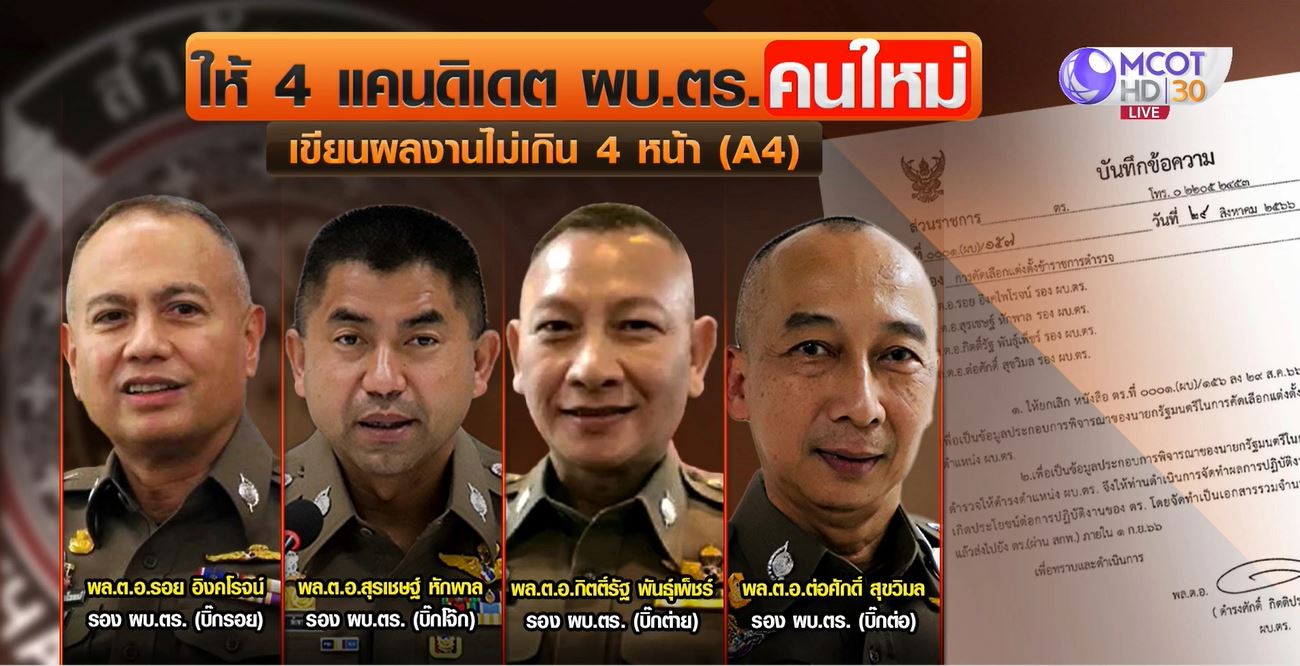 กรุงเทพฯ 31 ส.ค. – ผบ.ตร. สั่ง 4 รอง ผบ.ตร. เขียนวิสัยทัศน์ใส่กระดาษ A4 ไม่เกิน 4 แผ่น ถึง “เศรษฐา” เพื่อประกอบการคัดเลือกเป็น ผบ.ตร. คนใหม่ ภายใน 1 ก.ย.นี้