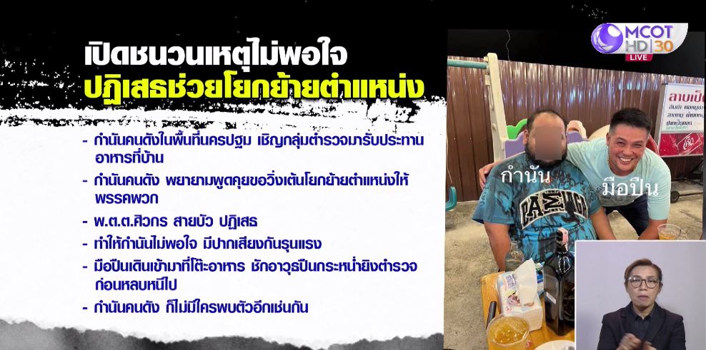 สำหรับชนวนเหตุยิงอุกอาจครั้งนี้ มาจากกำนันคนดังในพื้นที่นครปฐม ได้เชิญกลุ่มตำรวจมารับประทานอาหาร พูดคุยกันที่บ้าน โดยอ้างว่าอยู่ในพื้นที่เดียวกัน จึงอยากทำความรู้จักกันไว้ แต่ปรากฏว่ากำนันคนดังกล่าวกลับพยายามพูดคุยโน้มน้าวขอวิ่งเต้นโยกย้ายตำแหน่งให้พรรคพวก โดยอยู่ในสายงานสังกัดของ พ.ต.ต.ศิวกร ผู้เสียชีวิต แต่กลับถูกปฏิเสธ เนื่องจากเป็นที่รู้กันดีว่า พ.ต.ต.ศิวกร เป็นคนตรงไปตรงมา พร้อมทั้งให้เหตุผลว่าต้องเป็นไปตามกฎข้อระเบียบของทางต้นสังกัด และดูกันที่ผลงานเป็นหลัก ทำให้กำนันคนดังกล่าวไม่พอใจ จนมีปากเสียงกันรุนแรง ก่อนที่กำนันจะลุกออกจากโต๊ะอาหารไปด้วยท่าทีโกรธเคือง ไม่นานก็มีคนร้ายเดินเข้ามาที่โต๊ะอาหารที่กลุ่มตำรวจนั่งอยู่ แล้วชักอาวุธปืนออกมากระหน่ำยิงใส่ตำรวจ และหลบหนีไป ส่วนกำนันคนดังก็ไม่มีใครพบอีกเช่นกัน