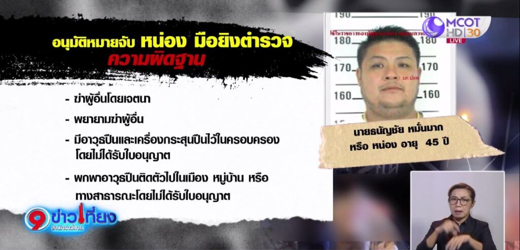 สำหรับ “หน่อง” มือปืน พบมีประวัติก่อเหตุโชกโชน ต้องคดีมาทั้งคดีพยายามฆ่า และคดีเกี่ยวกับอาวุธปืน และทำให้เสียทรัพย์ ถือเป็นบุคคลอันตราย. – สำนักข่าวไทย