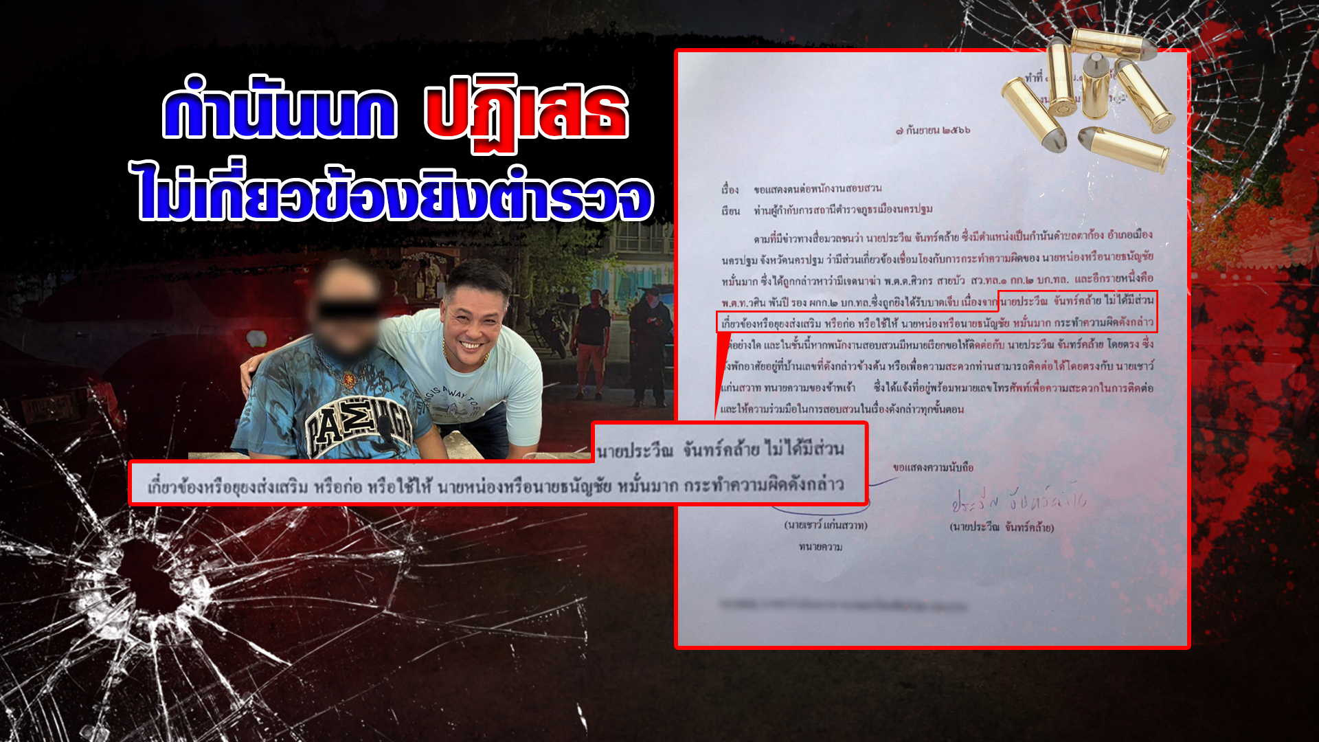 ทั้งนี้ ก่อนที่ “กำนันนก” จะเข้ามอบตัวกับตำรวจ ทางทนายความได้ยื่นหนังสือต่อผู้กำกับการ สภ.เมืองนครปฐม มีใจความประมาณว่า ปฏิเสธข้อกล่าวหา ไม่ได้ยุยงหรือให้นายหน่อง มือปืน ก่อเหตุยิงสารวัตรทางหลวง