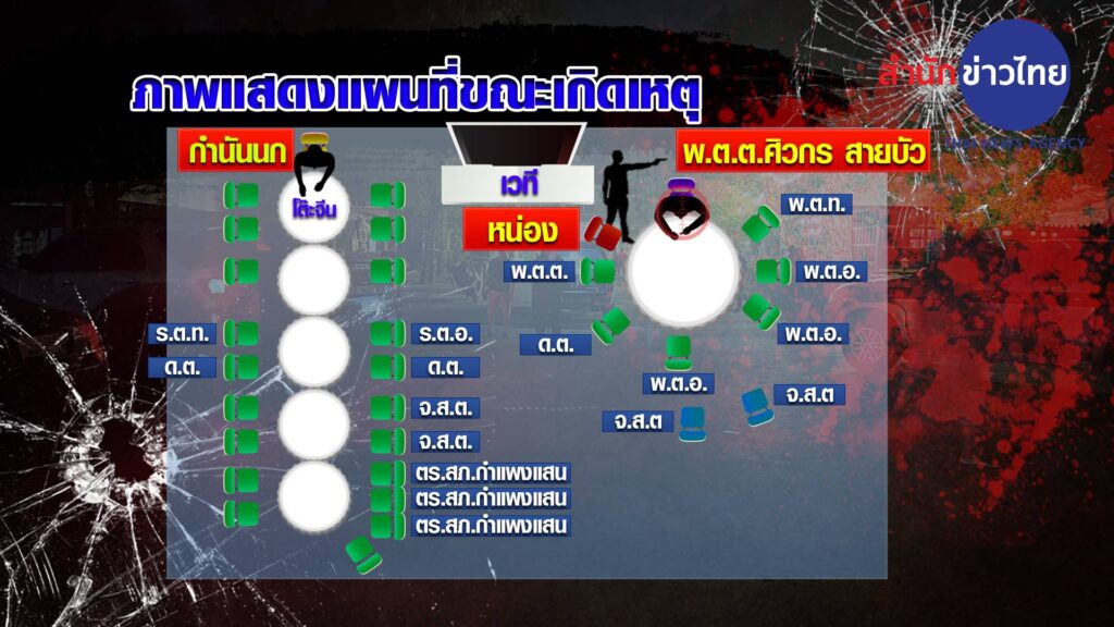 สำนักข่าวไทย เปิดแผนผังคืนงานเลี้ยง ในบ้านกำนันนก โดยช่วงที่ “นายหน่อง” มือปืนเดินอุกอาจเข้าไปจ่อยิง ระยะเผาขน พ.ต.ต.ศิวกร สายบัว สารวัตรตำรวจทางหลวง เสียชีวิต พบว่า โต๊ะที่เกิดเหตุ ซึ่งเป็นโต๊จีนทรงกลม มีนายตำรวจยศพันตำรวจเอก ทั้งในพื้นที่และจากกรุงเทพฯ นั่งอยู่ แต่เมื่อเกิดเหตุ ทุกคนกลับแยกย้าย หรือแค่ช่วยนำคนเจ็บส่งโรงพยาบาล ไม่มีใครควบคุมตัว “นายหน่อง” เอาไว้
