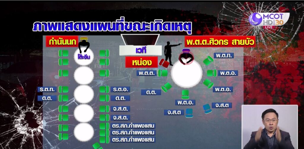 สำนักข่าวไทย เปิดแผนผังคืนงานเลี้ยงในบ้านกำนันนก ช่วงที่นายหน่อง มือปืนเดินอุกอาจเข้าไปจ่อยิง พ.ต.ต.ศิวกร สายบัว สารวัตรตำรวจทางหลวง