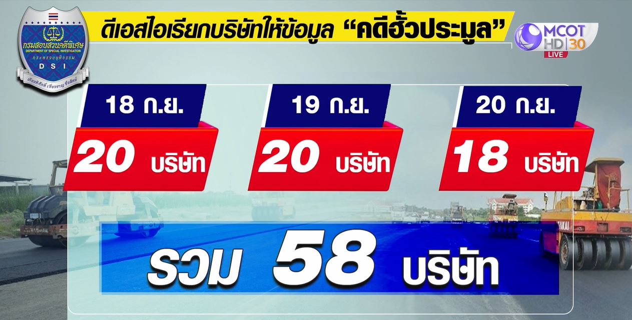 กรุงเทพฯ 18 ก.ย. – 20 บริษัทรับเหมาทยอยเข้าให้ปากคำดีเอสไอ เหตุซื้อซองแต่ไม่ยื่นเสนอราคาเข้าข่ายฮั้วประมูลให้ “กำนันนก” ได้งานหรือไม่ จ่อเรียกอีก 38 บริษัท รวมเป็น 58 บริษัท ทั้งหมดเรียกสอบในฐานะพยาน