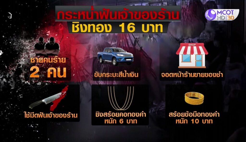 21 ก.ย. – 2 คนร้ายขับกระบะแคป ใช้มีดกระหน่ำฟันเจ้าของร้านขายของชำ ริมถนนเพชรเกษม ต.อ้อมใหญ่ อ.สามพราน จ.นครปฐม บาดเจ็บสาหัส 2 คน ก่อนชิงทอง 16 บาทหนี ตำรวจรู้ตัวคนร้ายแล้ว ขอศาลอนุมัติหมายจับ เร่งล่ามาดำเนินคดี