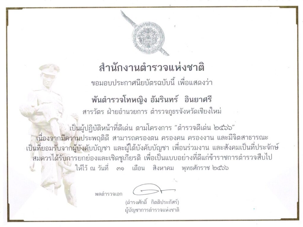 ด้าน พ.ต.ท.หญิง อัมรินทร์ อินยาศรี สว.ฝอ.ภ.จว.เชียงใหม่ ผู้ปฏิบัติหน้าที่ดีเด่น ตามโครงการ “ตำรวจดีเด่น 2566” เปิดเผยความในใจว่า งานอำนวยการ เป็นงานหนัก เป็นงานที่อยู่เบื้องหลังของทุกสายงานไม่ว่าจะเป็นงานสืบสวนปราบปราม งานจราจร สวัสดิการต่างๆ ของกำลังพลในสังกัด งานอำนวยการเป็นงานที่ต้องทำทุกวัน ต้องทำอย่างสม่ำเสมอ แม้ว่าจะทำให้เกิดผลการปฏิบัติเป็นรูปธรรมได้ยาก แต่ก็มีความภูมิใจที่ได้เป็นส่วนหนึ่งของการขับเคลื่อนงานอำนวยการ ได้ดูแลสิทธิ สวัสดิการ ของพี่ๆ น้องๆ ตำรวจในสังกัด ตนเคยได้รับรางวัลผู้ปฏิบัติหน้าที่ดีเด่นในสายงานอำนวยงานมาแล้วในปี 2557 เมื่อครั้งที่ พล.ต.อ.ดำรงศักดิ์ กิตติประภัสร์ ผบ.ตร. ดำรงตำแหน่ง รอง ผบช.ภ.5 และท่านได้มองเห็นถึงความสำคัญของสายงานอำนวยการเทียบเท่ากับสายงานอื่นๆ ทำให้ผู้ปฏิบัติงานอำนวยการเกิดขวัญและกำลังใจในการปฏิบัติหน้าที่เป็นอย่างยิ่ง ในปี 2566 ตนได้รับรางวัลนี้อีกครั้งแต่เป็นการรับรางวัลของ ผบ.ตร. ซึ่งสร้างความปลาบปลื้ม และภาคภูมิใจเป็นอย่างยิ่ง ที่ผู้บังคับบัญชาให้ความสำคัญตำรวจมดงาน อยากจะให้มีโครงการดีๆ แบบนี้ต่อไป เนื่องจากมีข้าราชการตำรวจอีกหลายนายที่ทำงานอย่างมีประสิทธิภาพ และสมควรได้รับการคัดเลือก ในส่วนของตนเองอยากจะขอปฏิญาณตนว่าจะรักษามาตรฐานการทำงานแบบนี้ต่อไป การที่ได้รับรางวัลเป็นเสมือนเครื่องเตือนใจให้ตั้งใจทำงานต่อไป .- สำนักข่าวไทย