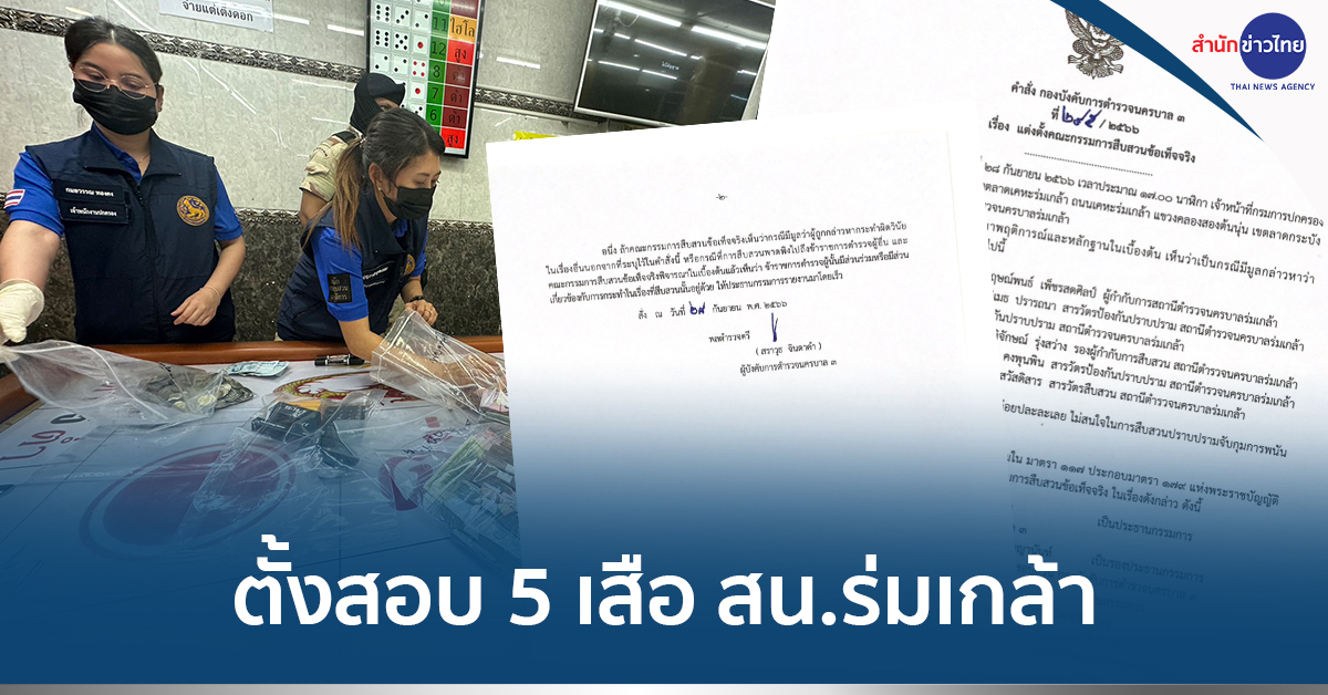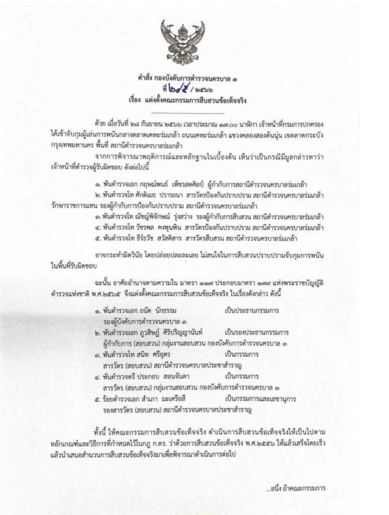 พล.ต.ต.สราวุธ จินดาคำ ผู้บังคับการตำรวจนครบาล 3 เซ็นคำสั่งตั้งกรรมการสอบ 5 เสือ สน.ร่มเกล้า หลังเมื่อเย็นวานนี้ เจ้าหน้าที่กรมการปกครอง นำกำลังบุกจับบ่อนการพนันกลางตลาด เคหะร่มเกล้าจับกุมนักพนันได้ 50 คน เจ้ามือ 17 คน อุปกรณ์การพนัน กล้องวงจรปิด 23 ตัว และเงินสดจำนวนหนึ่ง